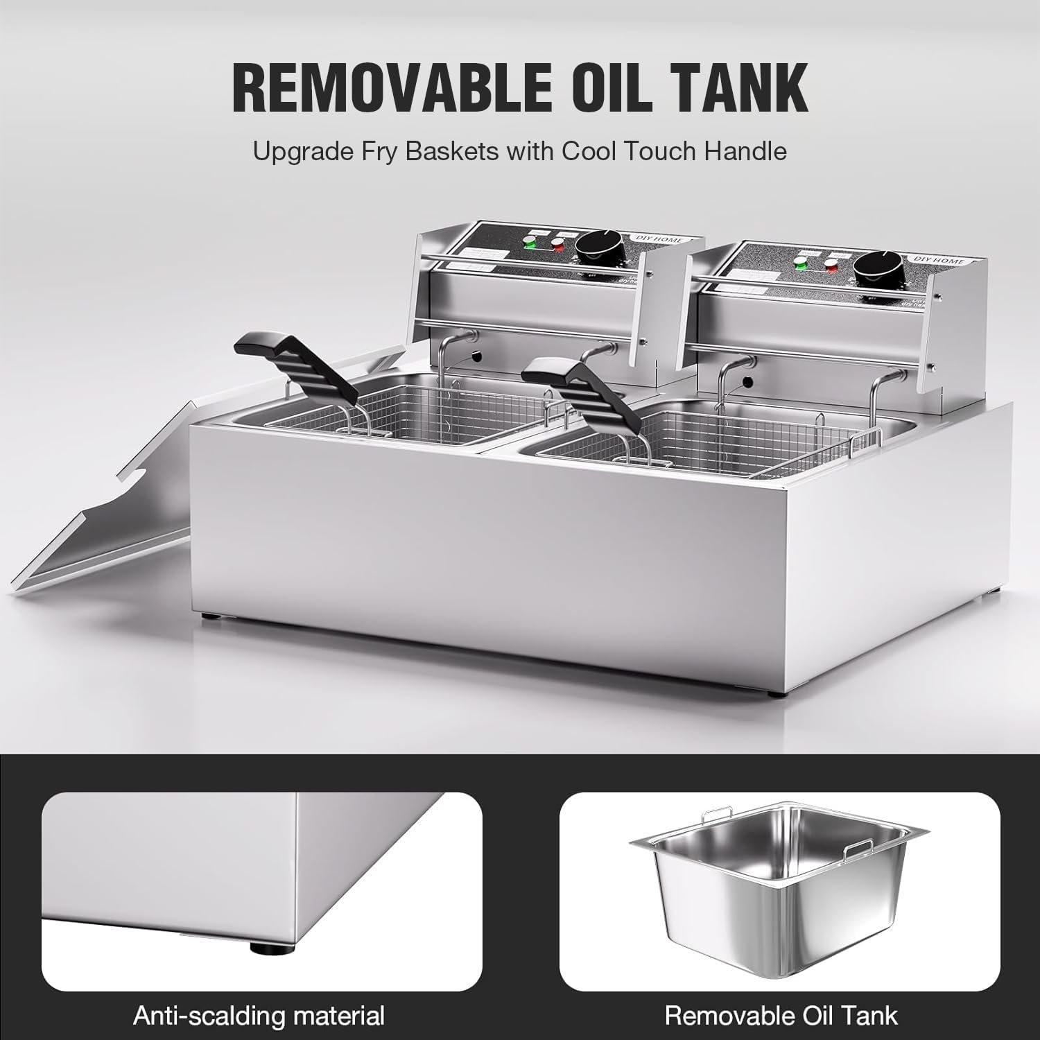 The total max capacity is 20.7QT/19.6L(10.35QT/9.8L for each basin) and the fryer baskets capacity are 12.7QT/ 12L(6.35QT/6L for each fryer basket). Constructed with heavy duty stainless steel, two heavy duty fry baskets is included. The commercial deep fryer has two high-efficiency stainless heating elements.