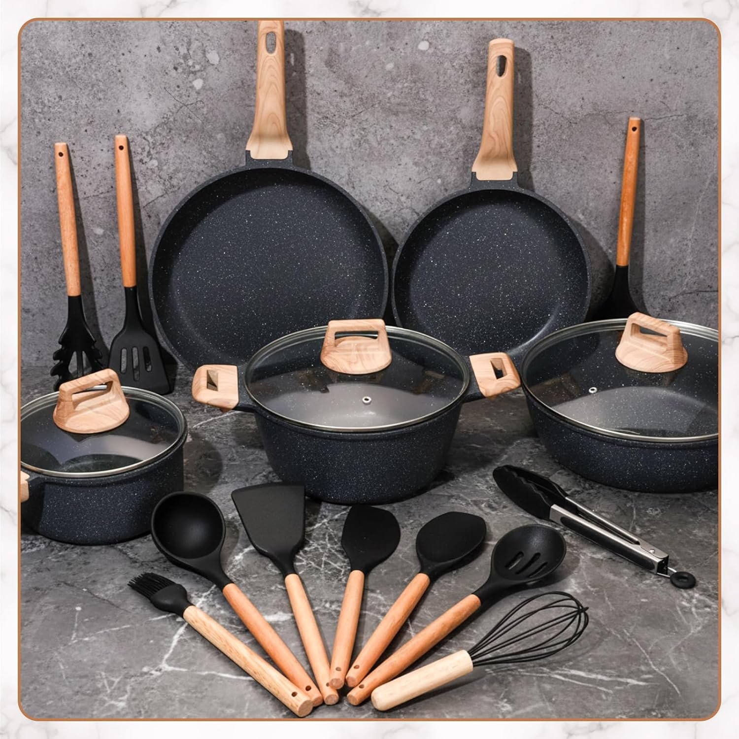 This 20-piece durable cookware set has a rich assortment, including frying pans, saucepans, a casserole, and various utensils, meeting diverse kitchen needs. The set includes a range of tools such as a spatula with a scald-resistant silicone body and wooden handle, pots made of reinforced die-cast aluminum, a 3-quart suate pan with lid, a 1.8-quart saucepan with lid, and a 4.5-quart casserole with lid. The cookware is made of solid non-stick granite, offering non-stick performance for safer and healthier cooking.