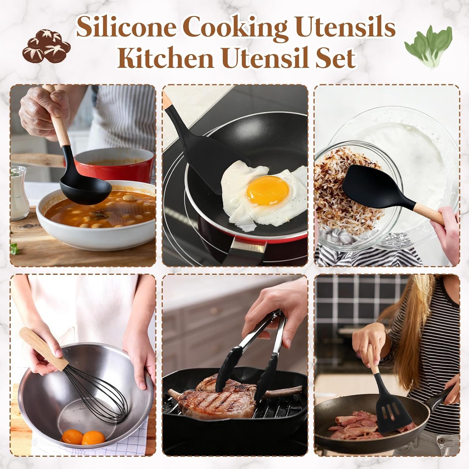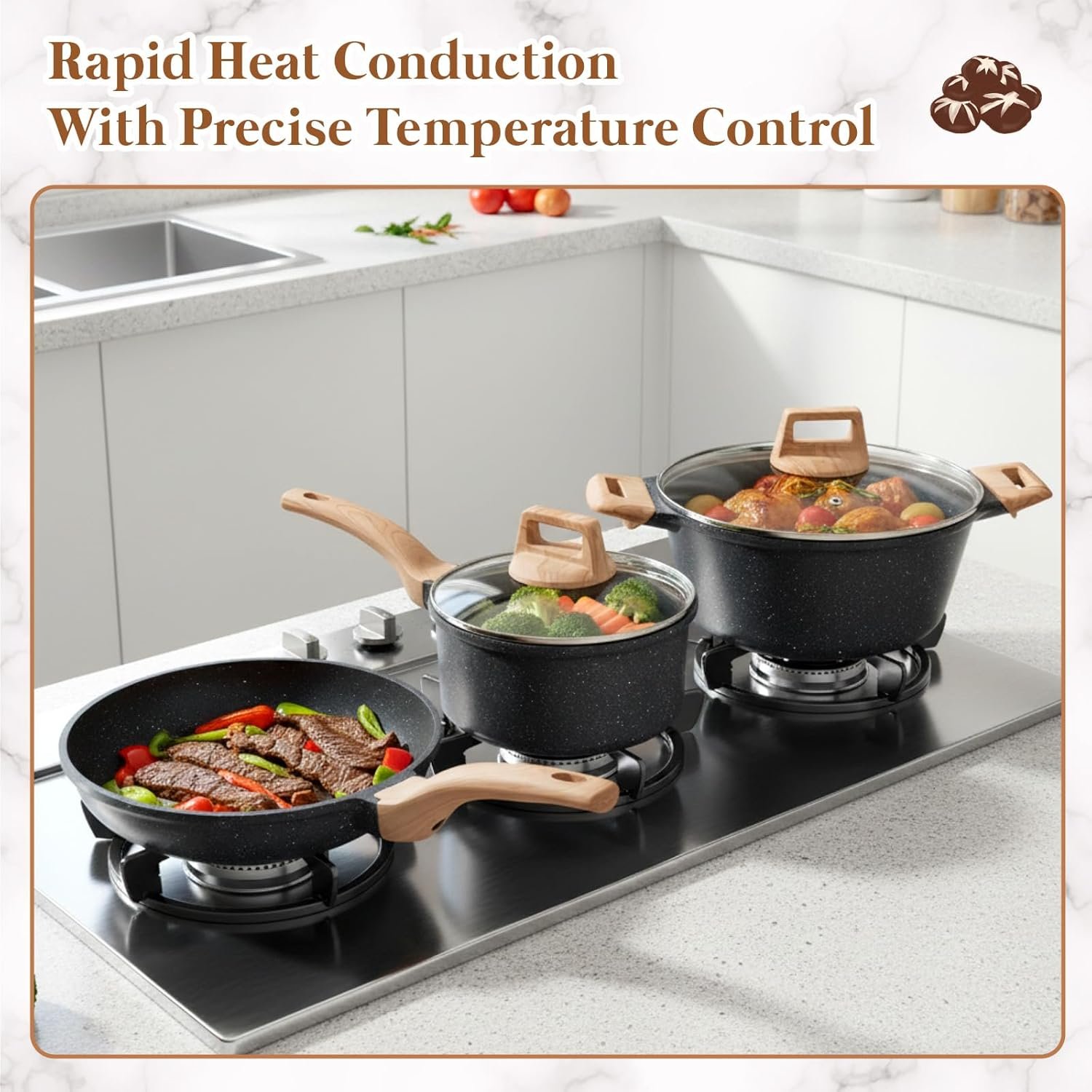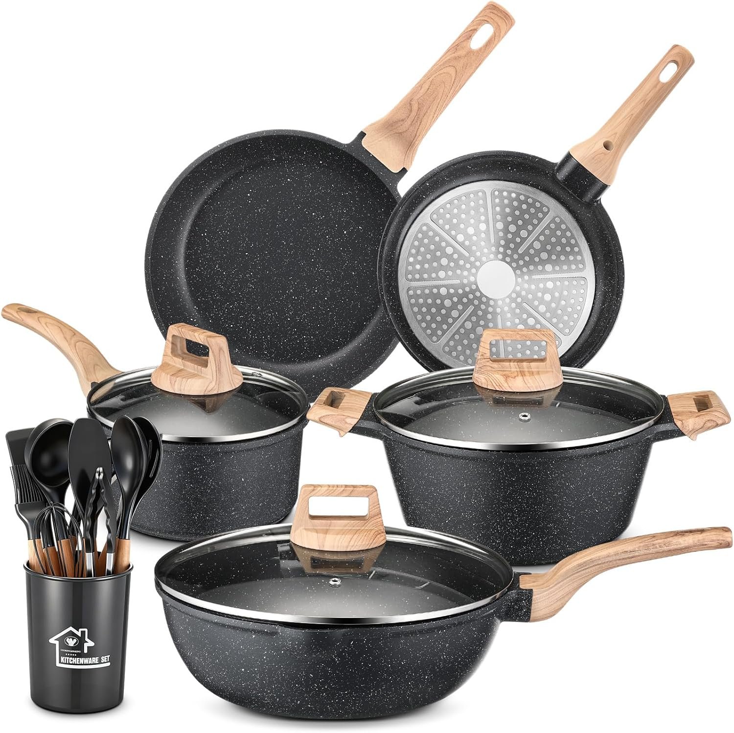 - Material: Solid non-stick granite, reinforced die-cast aluminum, scald-resistant silicone, and wooden handle