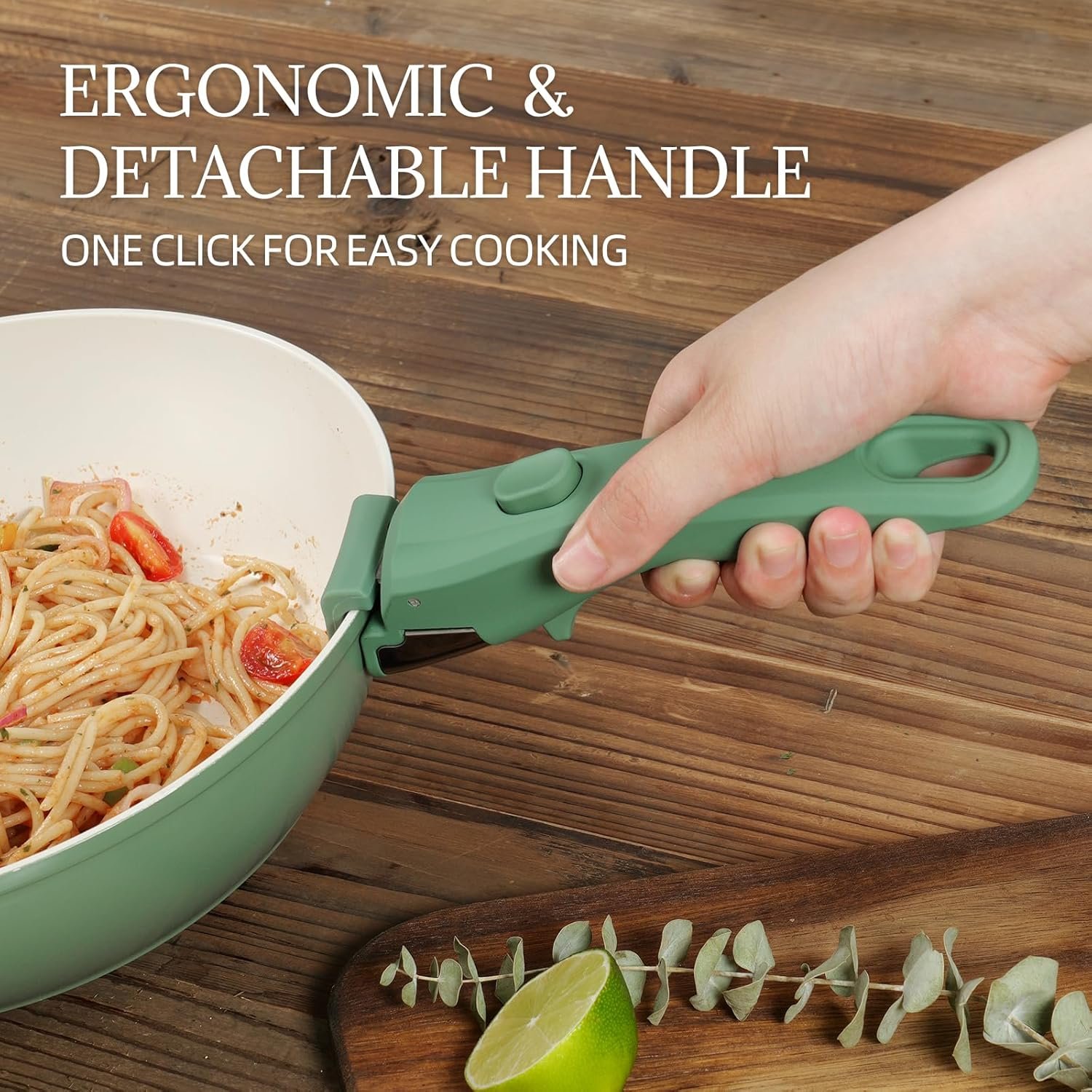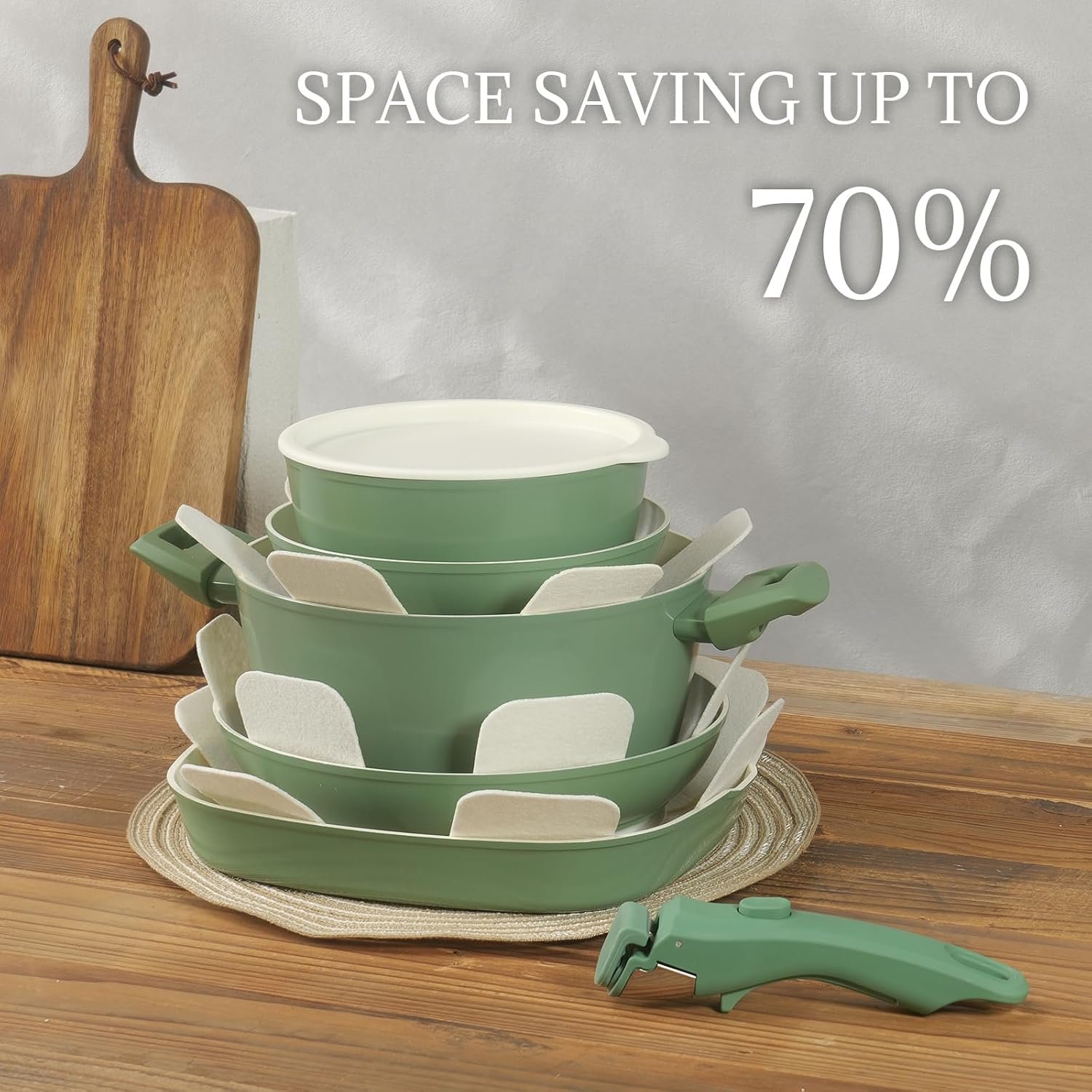 Our cookware set includes a sauté pan, pots, and pans, all featuring our innovative non-stick coating and detachable handle design. The set is perfect for compact kitchens, RVs, or campers, and is easy to store and transport. With its durable construction and easy-to-clean design, our cookware set is the perfect addition to any kitchen.