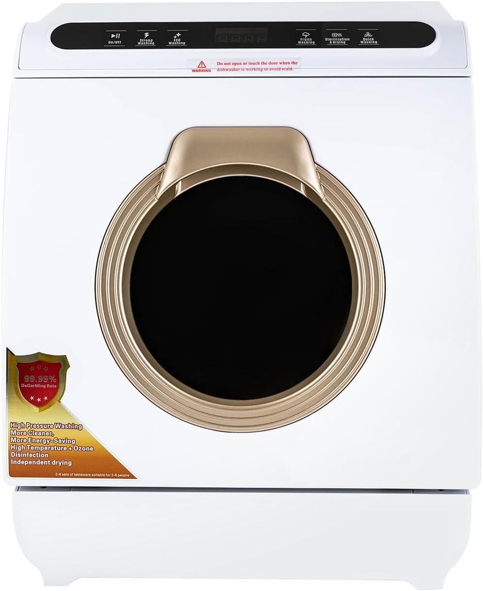 The countertop dishwasher is a high-quality, portable, and efficient appliance made from stainless steel and ABS materials, making it anti-corrosion, rust-resistant, strong, and durable. It features a 900w power, 5 cleaning modes, and a 3-in-1 function that includes dishwasher, dryer, and cabinet functions. The appliance has a touch screen control design, a wide screen to show the remaining time, and a flip-up door for easy placement and pickup of cookware.