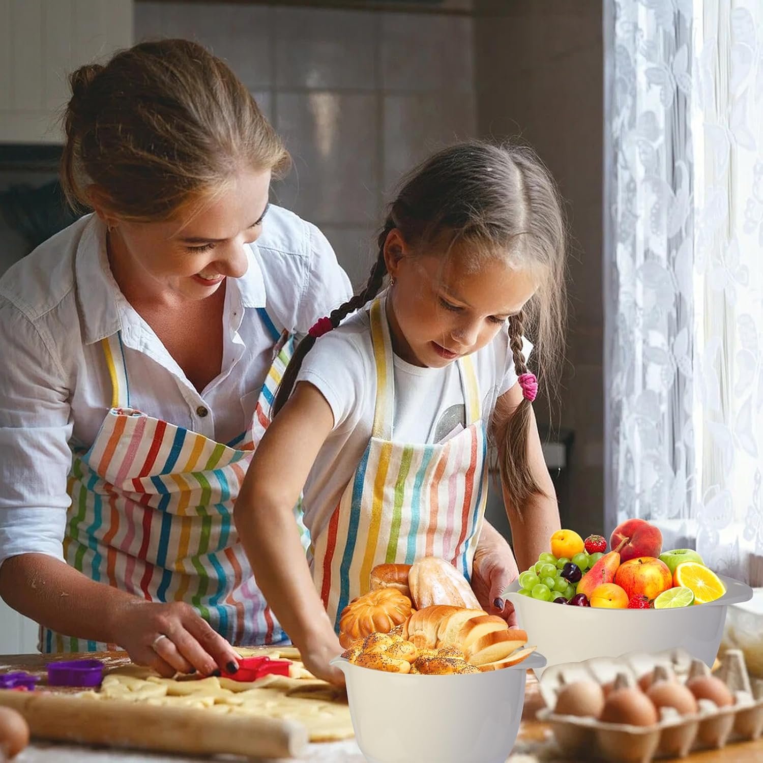 The mixing bowls set is perfect for baking, cooking, and soapmaking. The large bowl is ideal for mixing cake batter, cookie dough, or thick gingerbread dough, while the medium bowl is great for mixing homemade spices together. The small bowl is perfect for holding prepped veggies or fruits. The bowls nest nicely within one another for easy storage, and the lids can be hung separately for added convenience.