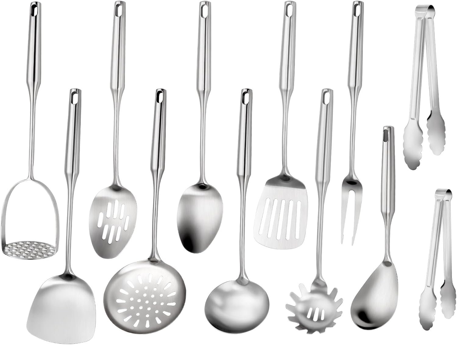 304 Stainlss Steel Kitchen Utensils Set, 12 Pcs Long Metal Utensils Set with Potato Masher, Spoon, Ladle, Skimmer, Turner, Pasta Server, Tongs etc(Dishwasher Safe)
