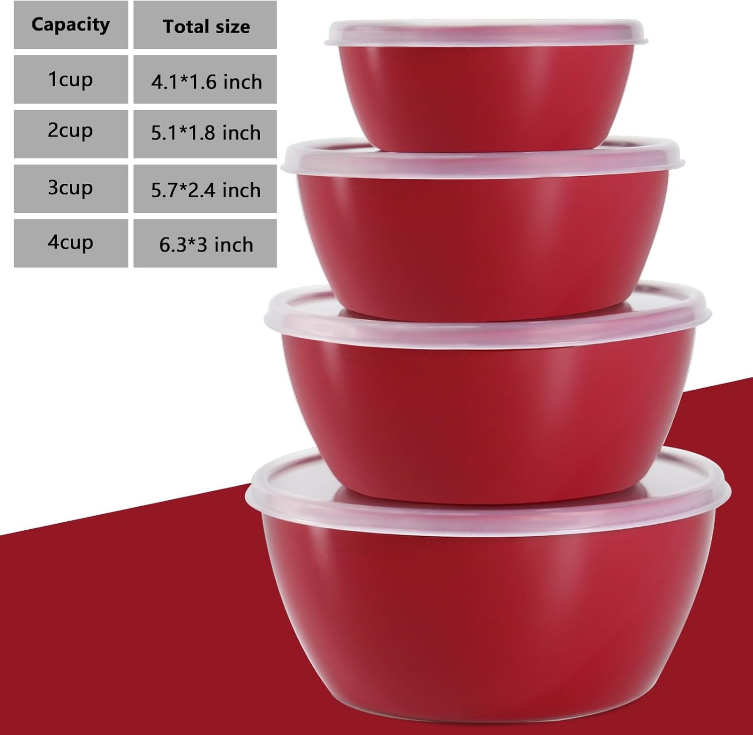 The red plastic bowl is Microwave Safe and Freezer Safe, and comes in 4 different sizes: 1 cup (4.1″ D x 1.6″H), 2 cup (5.1″D x 1.8″H), 3 cup (5.7″D x 2.4″H), and 4 cup (6.3″ D x 3″H). The storage bowls with lids can be used for prepping ingredients, packing snacks, storing leftover dips (keeps leftovers fresh and tasty), or mixing pasta or fruit salad. This is a practical addition to any kitchen.