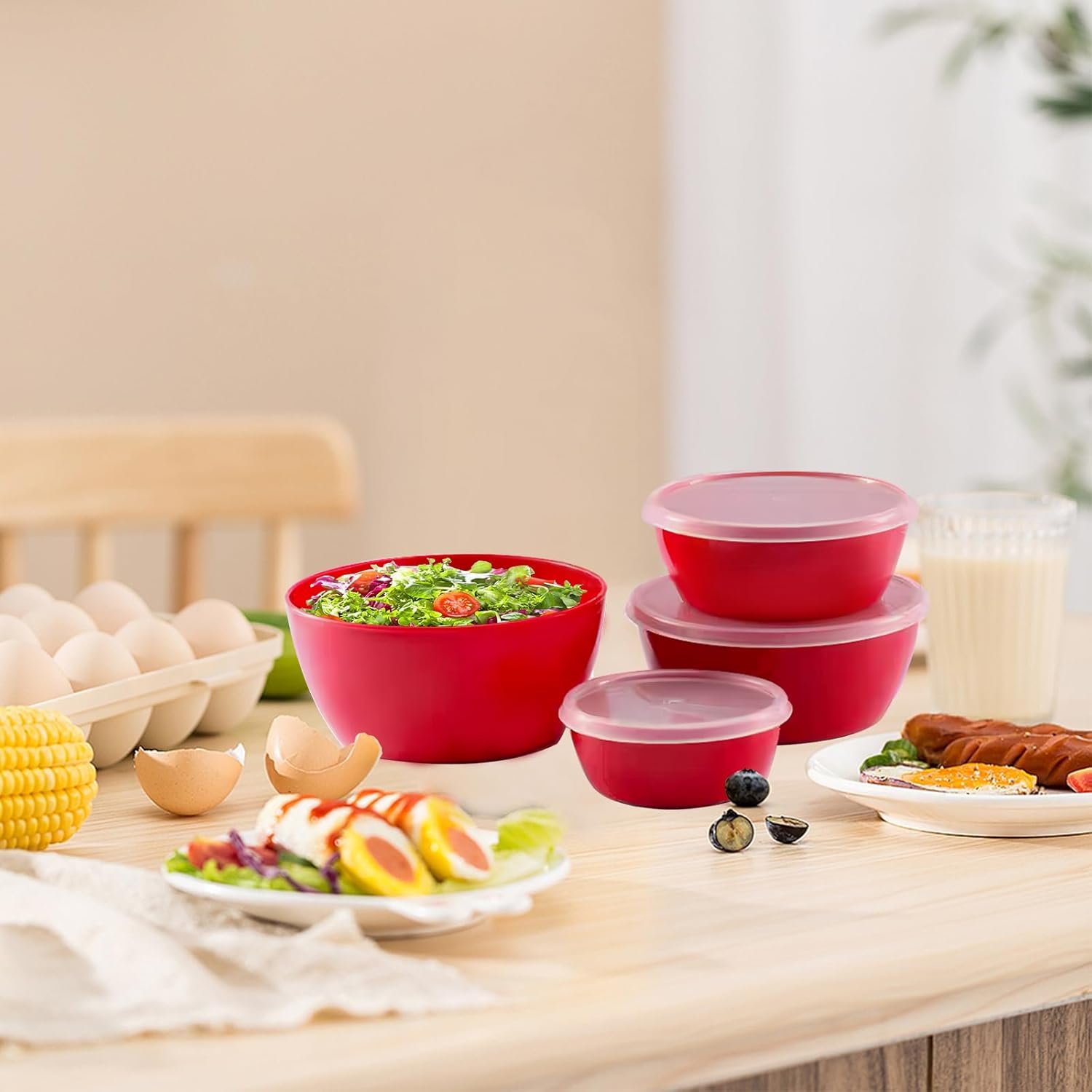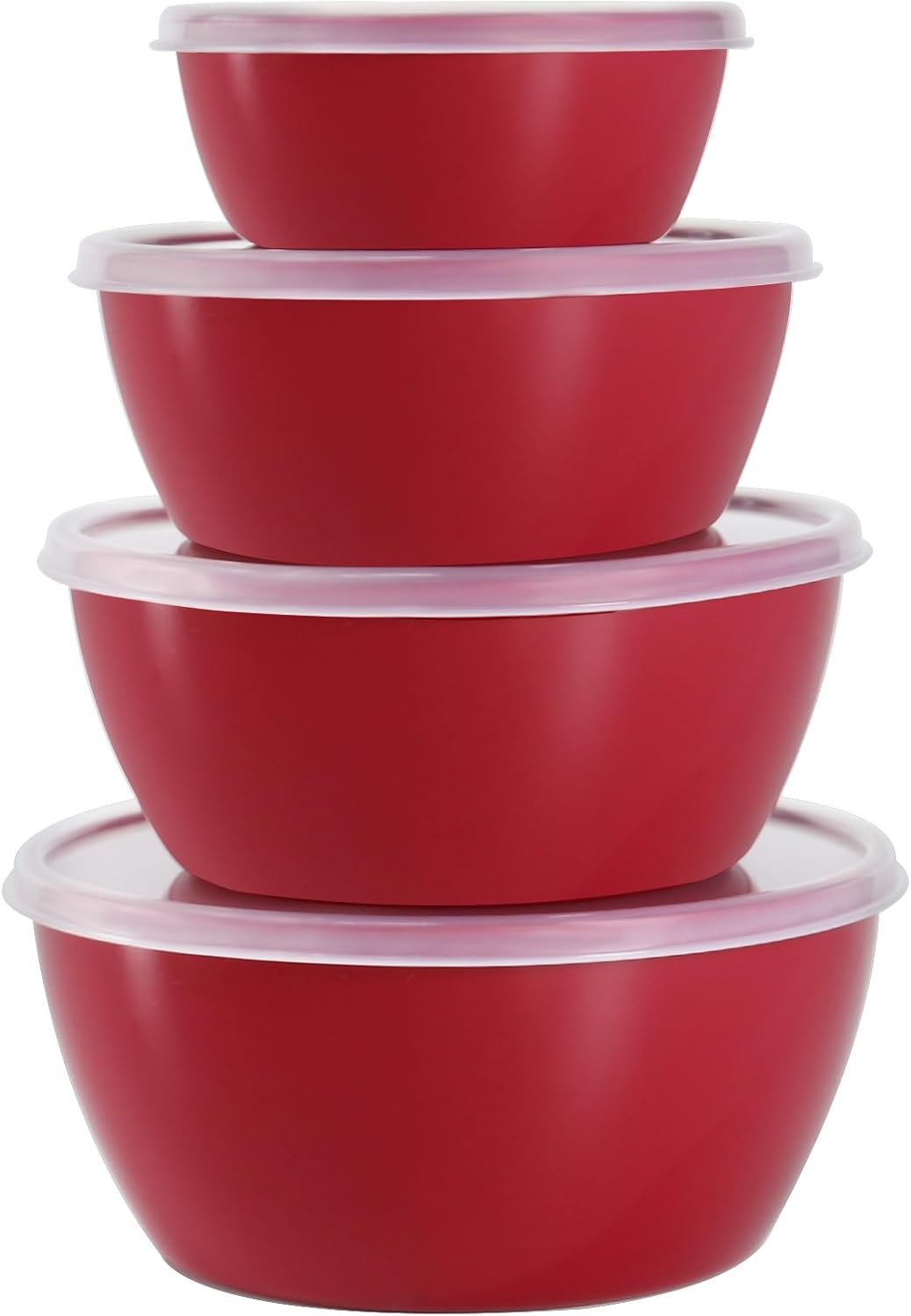 4-Piece Classic Plastic Prep Bowls with Lids, Nesting Plastic Small Mixing Bowl Set for Mixing, Baking, Prepping, Cooking and Serving Food, Microwave and Dishwasher Safe (Red)