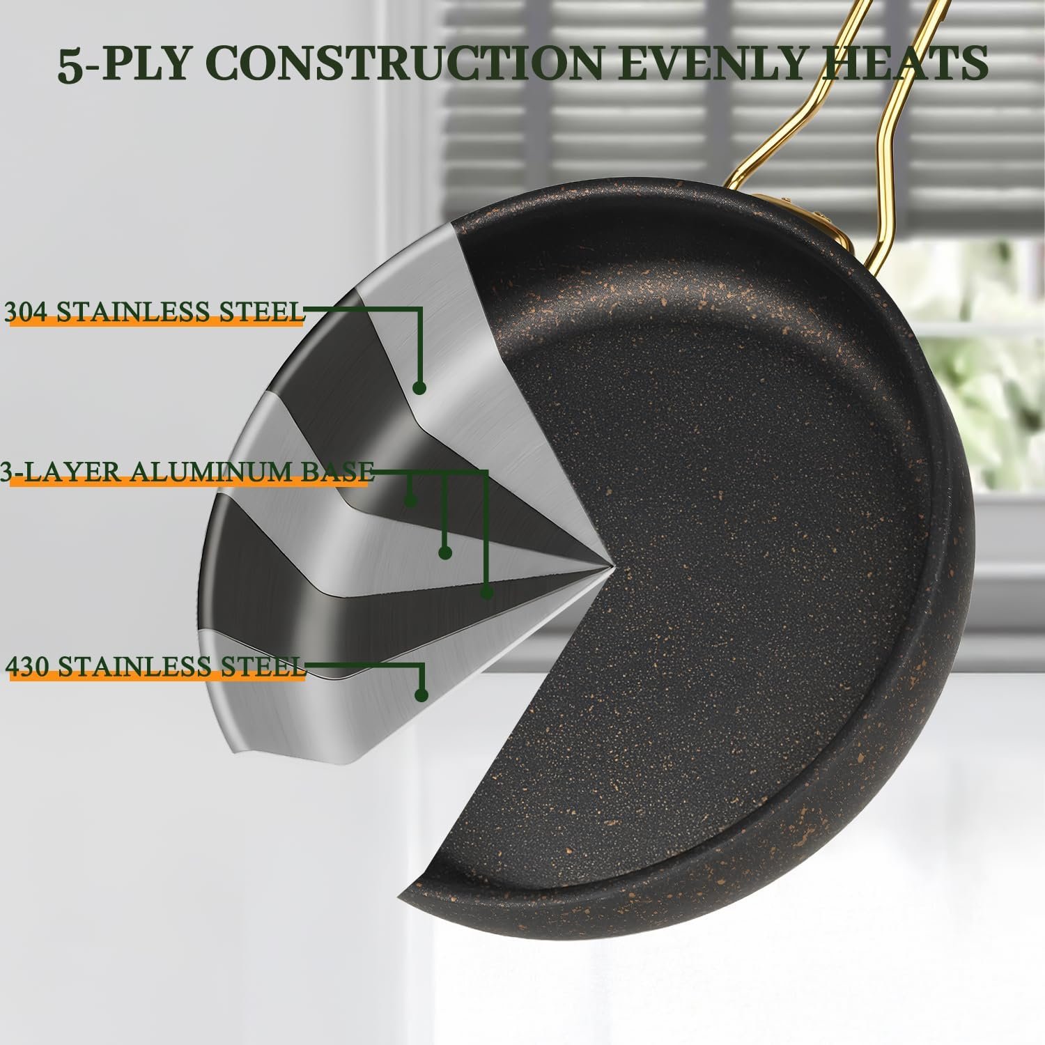 - 5-Layer Durability and Safeguard Coating: Our cookware set features a 5-layer design that combines durability with non-stick convenience. The stainless steel base provides strength, while the non-stick coating ensures effortless cooking and easy cleanup.
