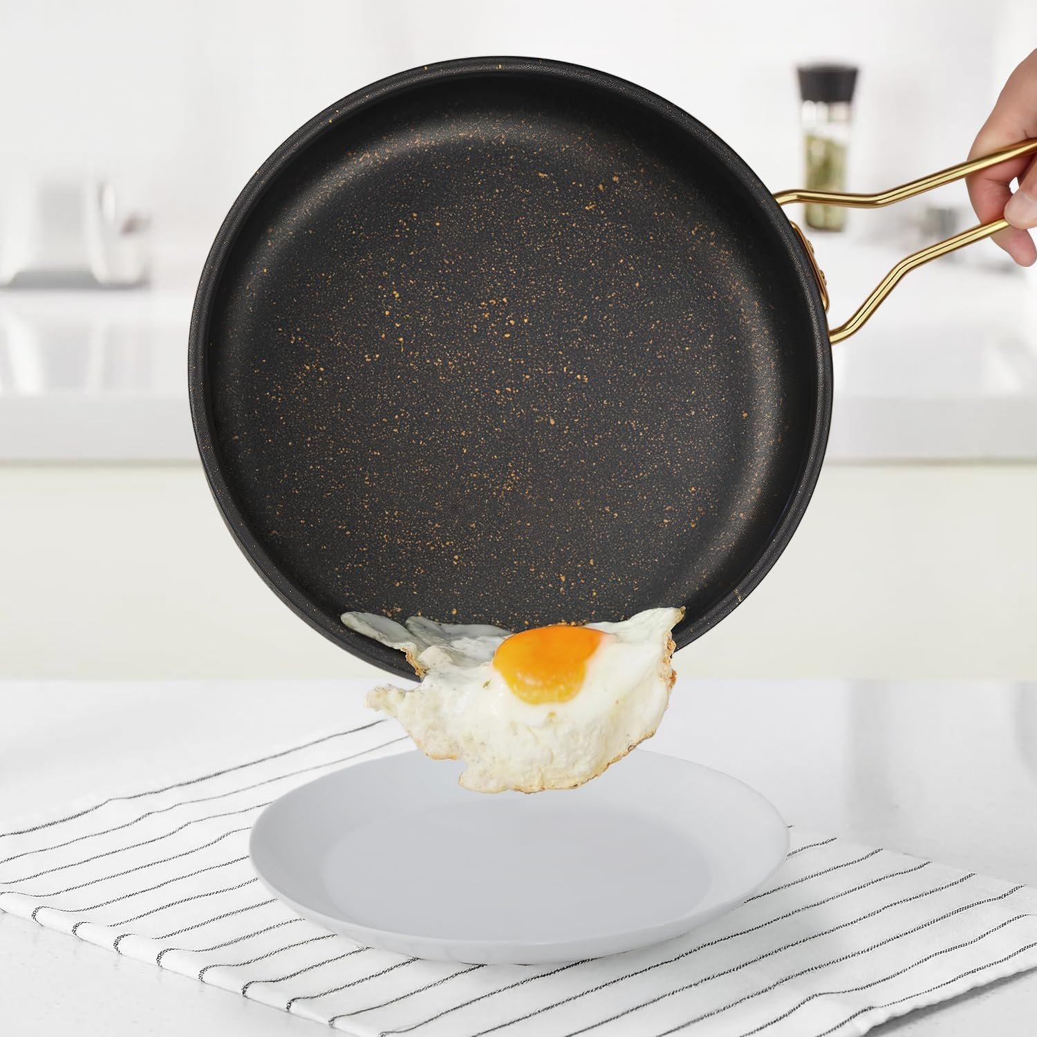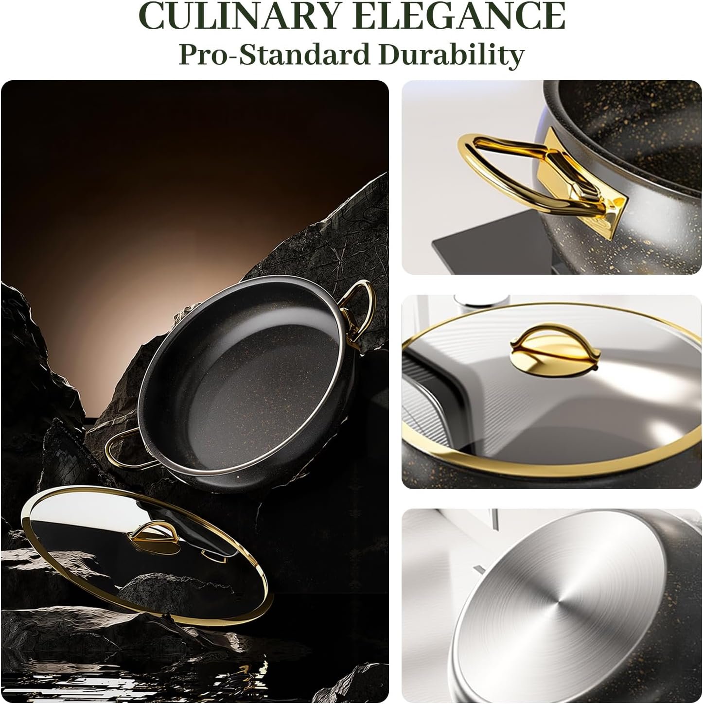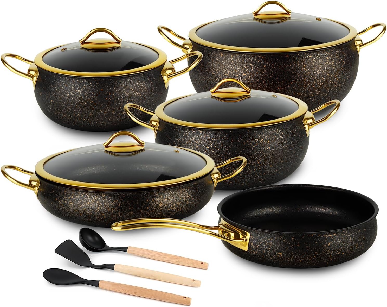 - Style Meets Substance: Transform your kitchen with our sleek, modern cookware set in an elegant midnight-black finish with golden flecks. The double stay-cool golden handles ensure easy handling, making it perfect for both cooking and serving.