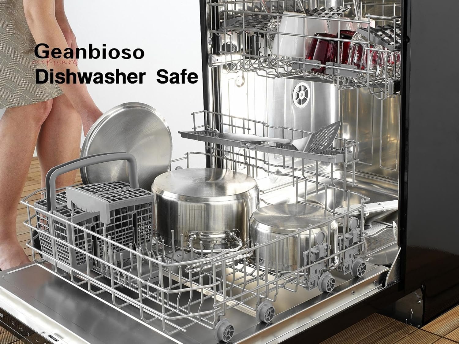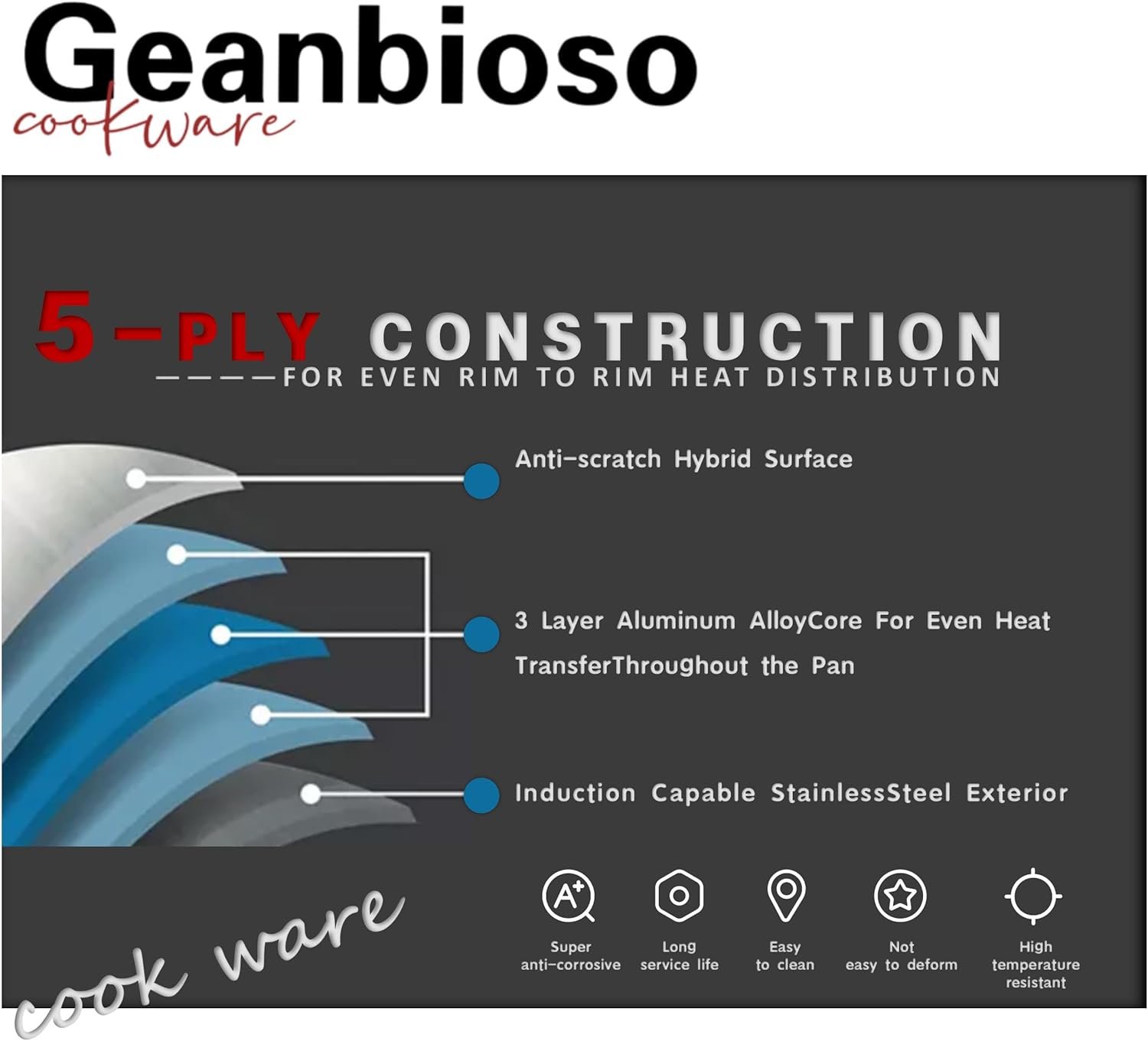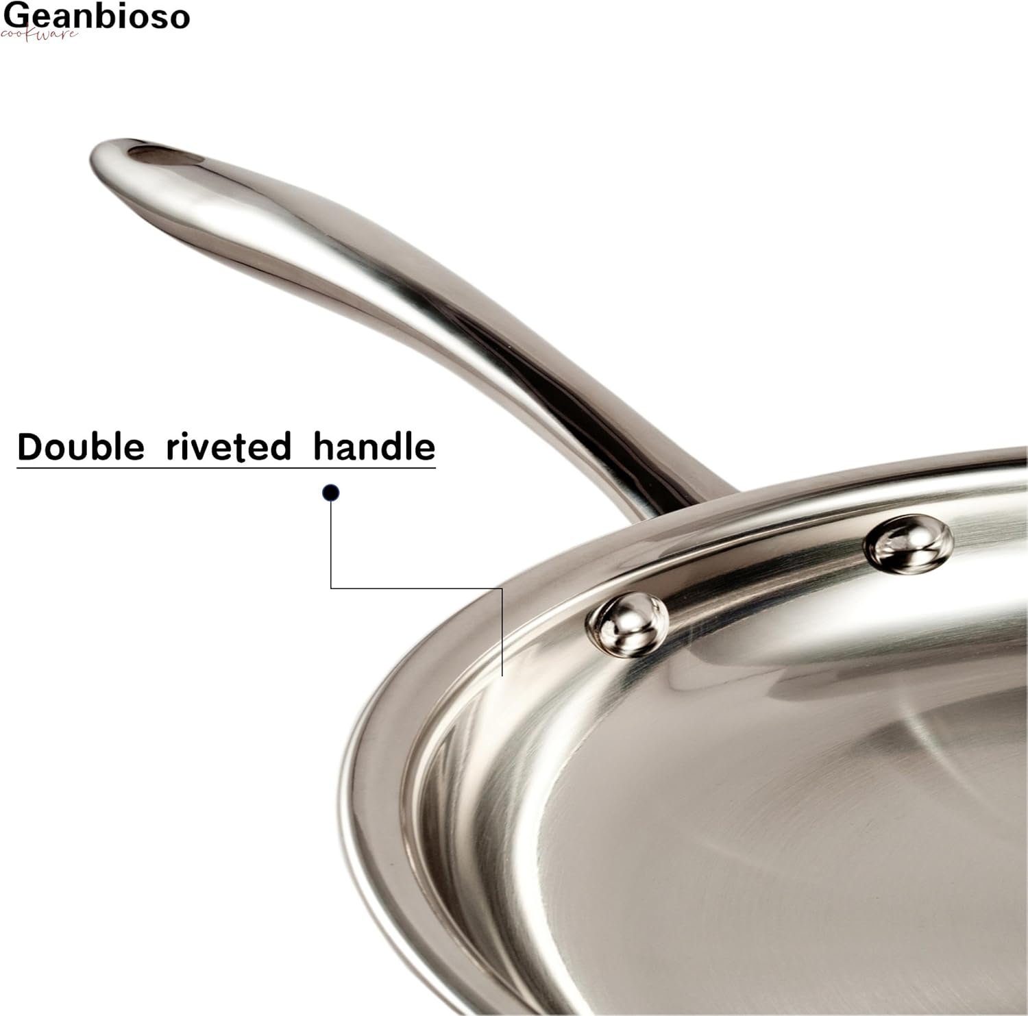 The GEANDIOSO 5-ply stainless steel cookware set is crafted from heavy-duty materials, featuring a 430 magnetic-conducting stainless steel outer layer, a 3-layer aluminum alloy core for even heat transfer, and a physically non-stick interior surface. This construction ensures a long service life of up to 20 years or more.