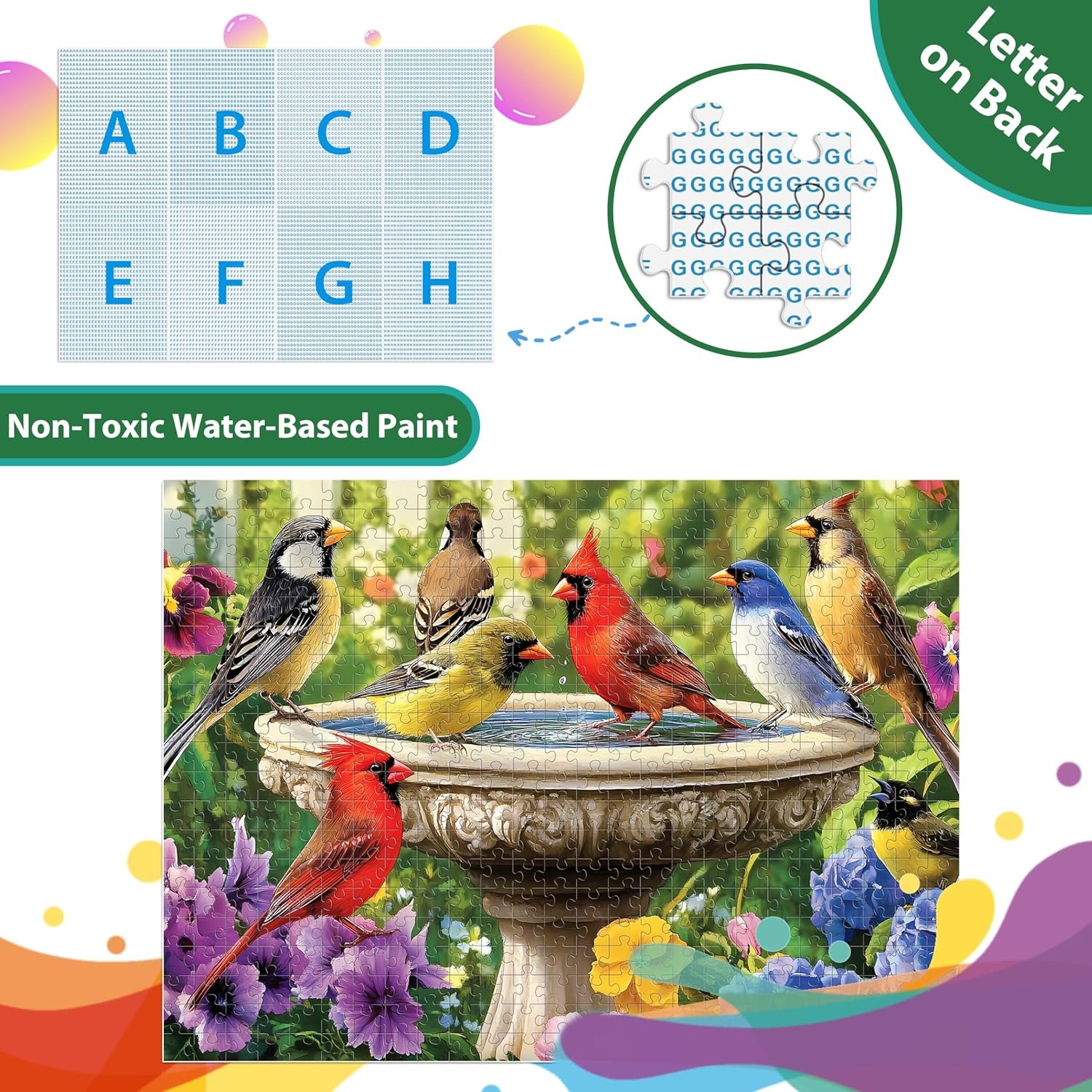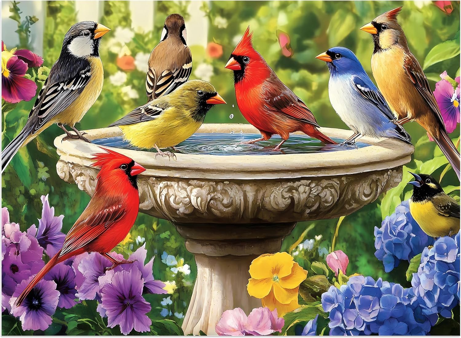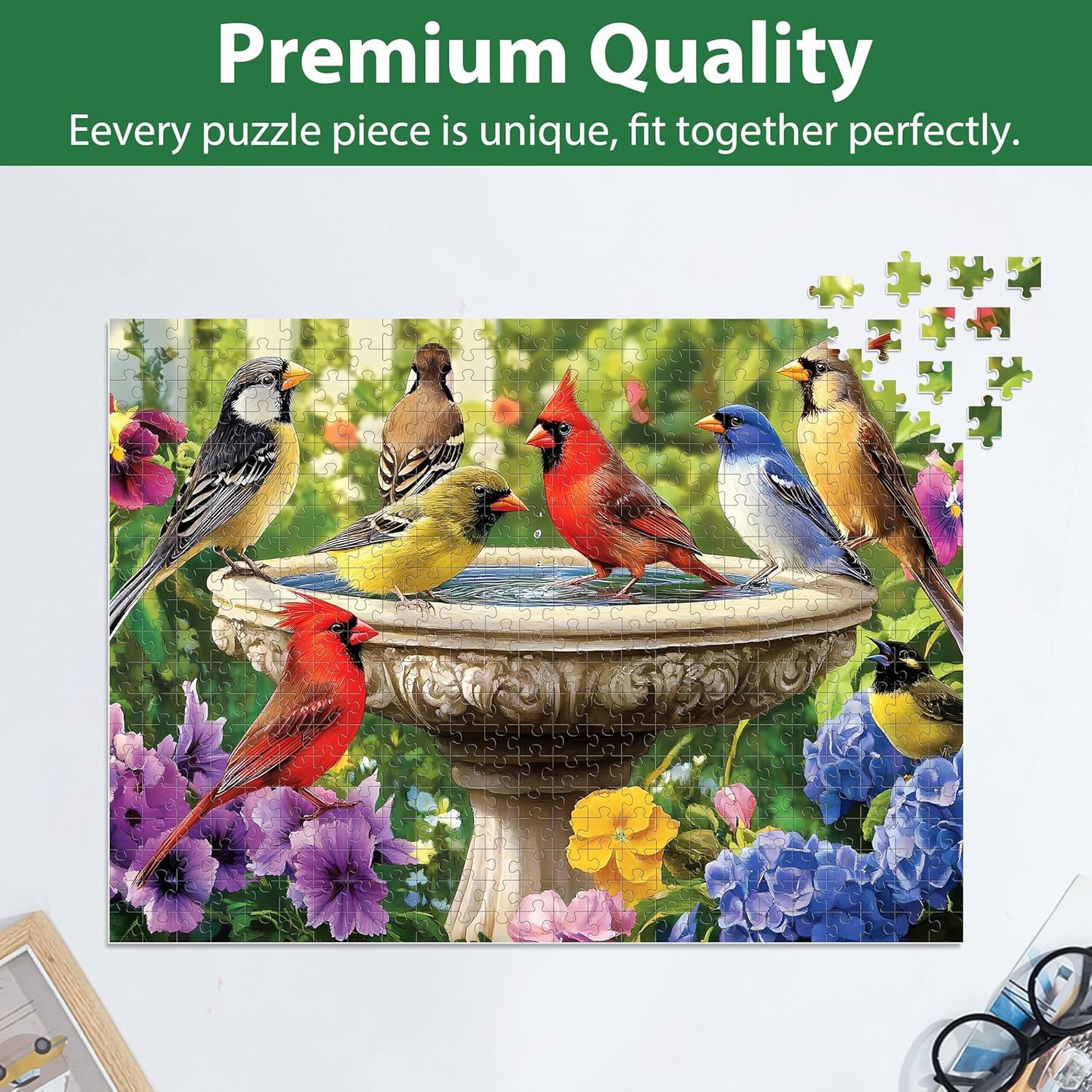 Birds Puzzles 500 pieces is a captivating jigsaw puzzle that features a group of colorful birds gathered by a tranquil fountain, surrounded by a vibrant bloom of flowers. The scene exudes peace and beauty, creating a sense of harmony that invites you to pause and appreciate the perfect moment. Made from durable, 100% recycled cardboard and printed with non-toxic ink, this puzzle is not only eco-friendly but also safe for adults to enjoy.