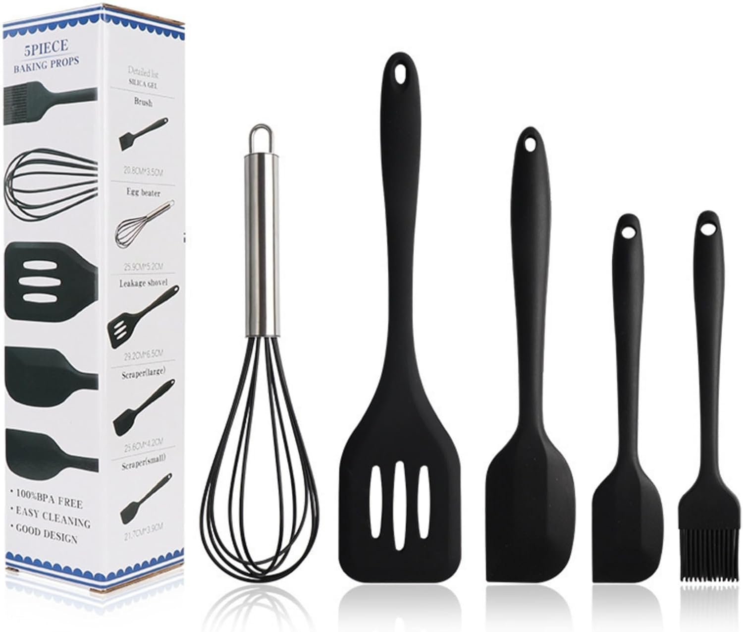 Home Cooking Utensil Sets 5pcs Silicone Cooking Utensil Set – Non-Stick Heat-Resistant Kitchen Tools with Whisk, Spoon, Spatula & Brush for Home Cooks & Housewarming – BLACK