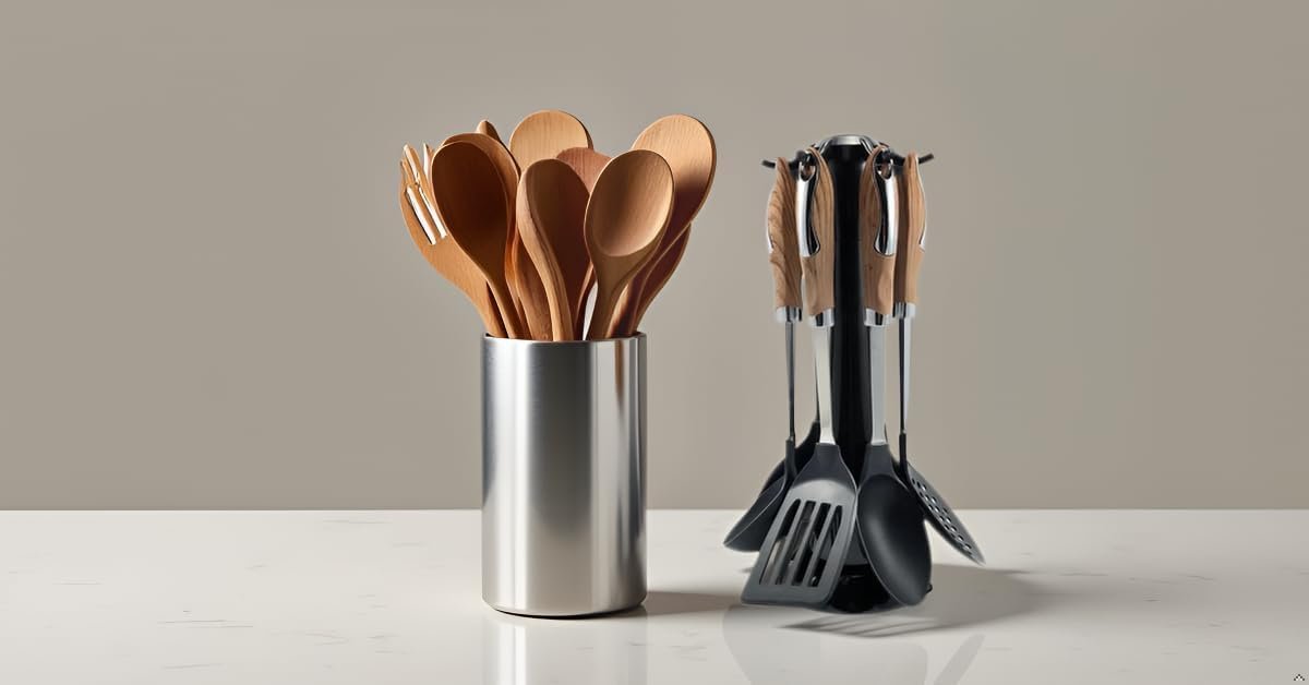 Home Cooking Utensil Sets 6‑Piece Kitchen Utensil Set with Rotating Stainless Steel Stand – Nonstick Cooking Tools with Ergonomic Wood Handles – Space‑Saving, Heat‑Resistant, Stylish Gift for Home Cooks
