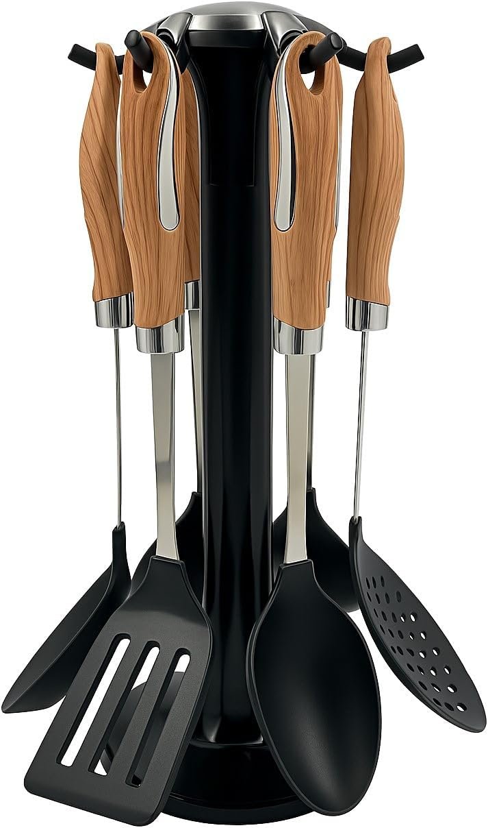 • Complete Cooking Essentials: Includes 6 versatile utensils (slotted spoon, 2 solid spoons, slotted turner, solid turner, soup ladle) plus a sleek rotating stand for easy access and organized storage.