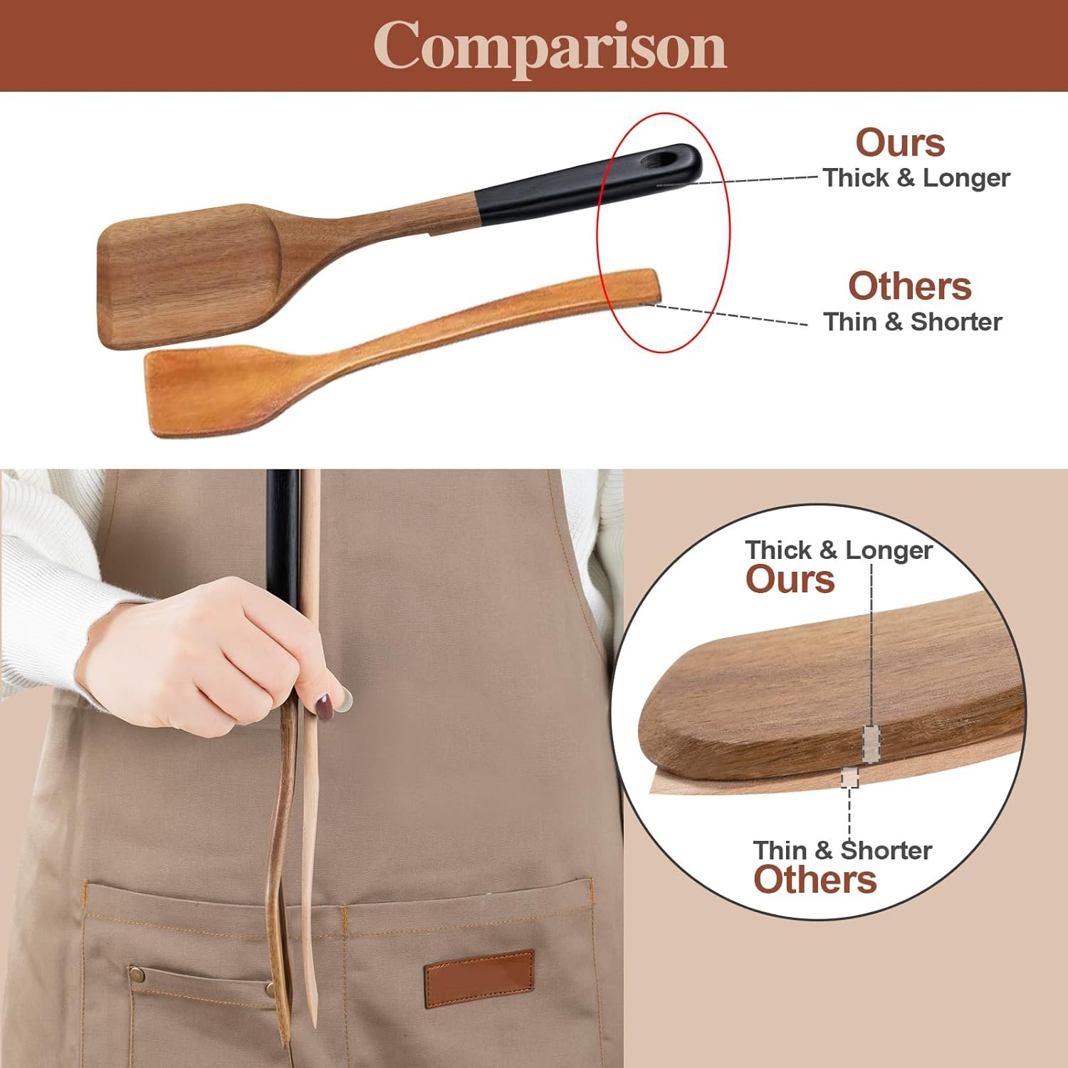 - Innovative notch design on the back of the wooden spatula for secure resting on pot and pan edges