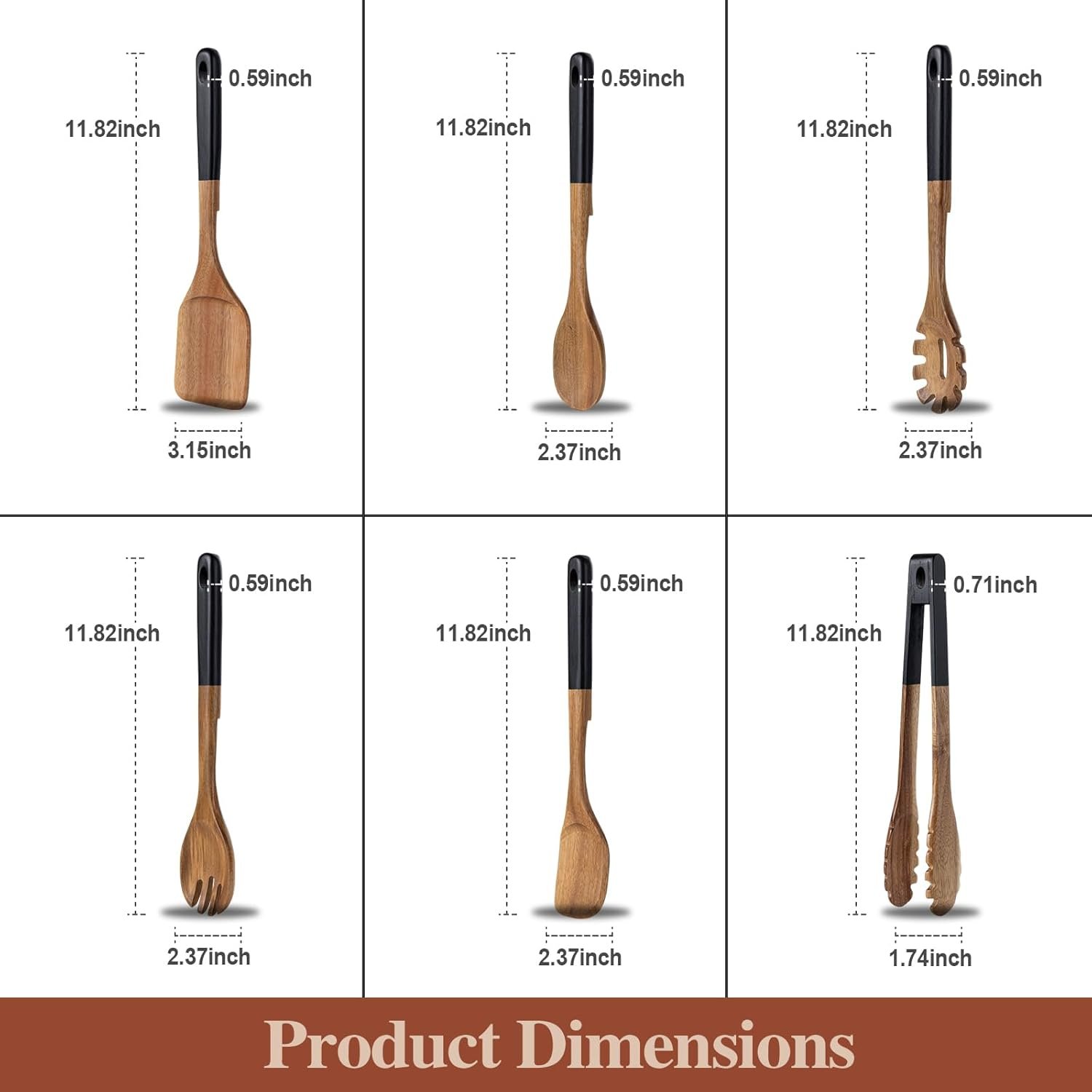 This wooden utensil set is made from high-quality acacia wood and includes 6 pieces of wooden cooking utensils: wooden tong, wooden spoon, wooden spatula, wooden salad fork, wooden pasta server, and wooden corner spoon. Our wooden spatula for cooking will cover all your basic cooking needs.