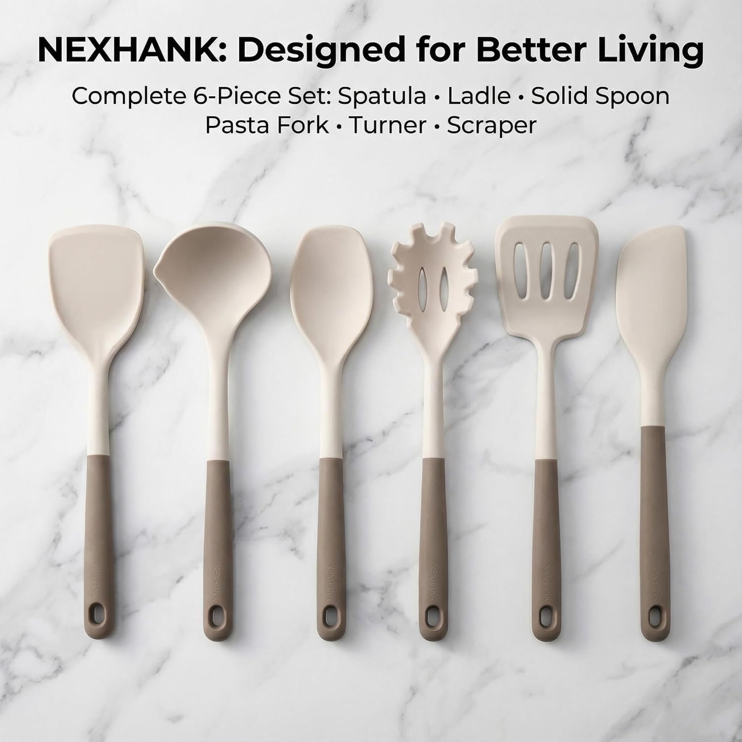 - 6-piece set includes spatula, ladle, skimmer, pasta fork, turner, and scraper