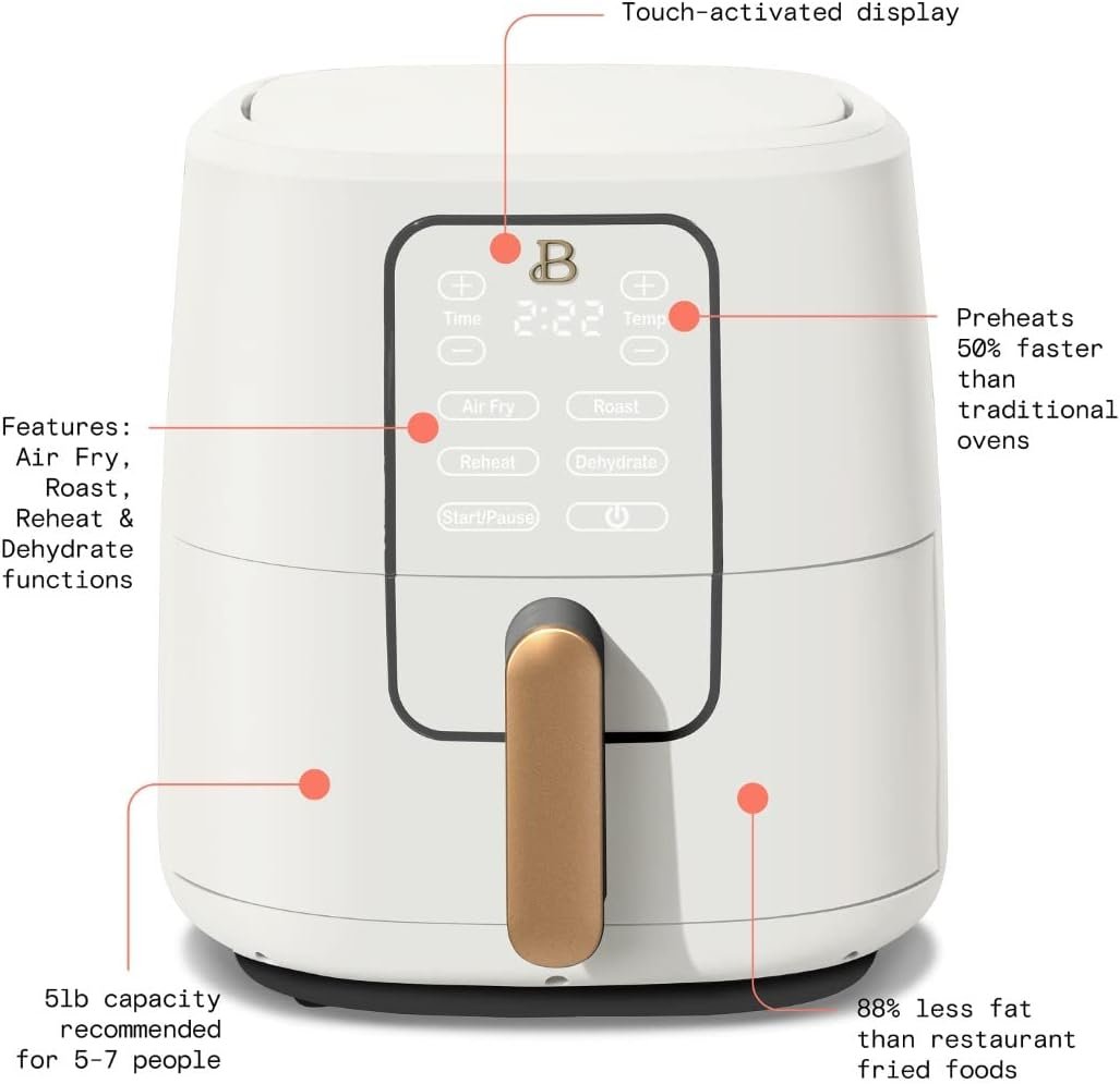 - Versatile in its functions, allowing for air frying, roasting, reheating, and dehydrating with little-to-no oil needed.