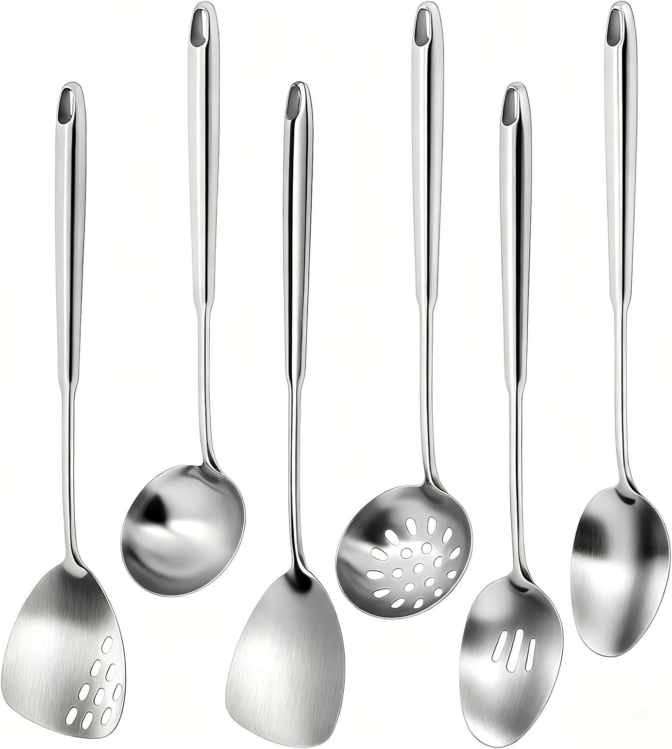 This 6Pcs Stainless Steel Kitchen Utensils Set is the perfect addition to any kitchen. Made of premium 304 stainless steel, these durable and rustproof cooking utensils are built to last, safe for daily use, and resistant to bending or breaking. The complete 6-piece set includes a wok spatula, serving spoons, and a ladle set, giving you all the essential kitchen tools for stir-frying, mixing, serving, and cooking at home or outdoors.