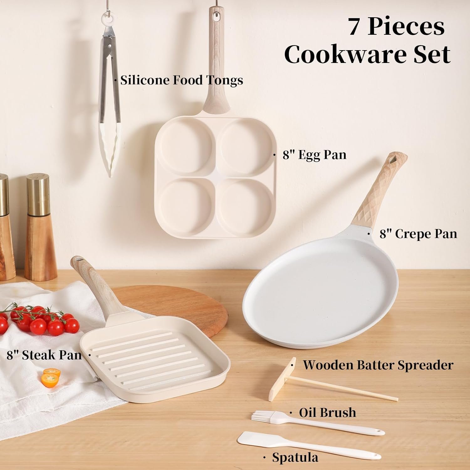 • Essential Accessories: The set comes with matching silicone food tongs, an oil brush, a spatula, and a wooden batter spreader, providing everything needed for gourmet breakfast and beyond.