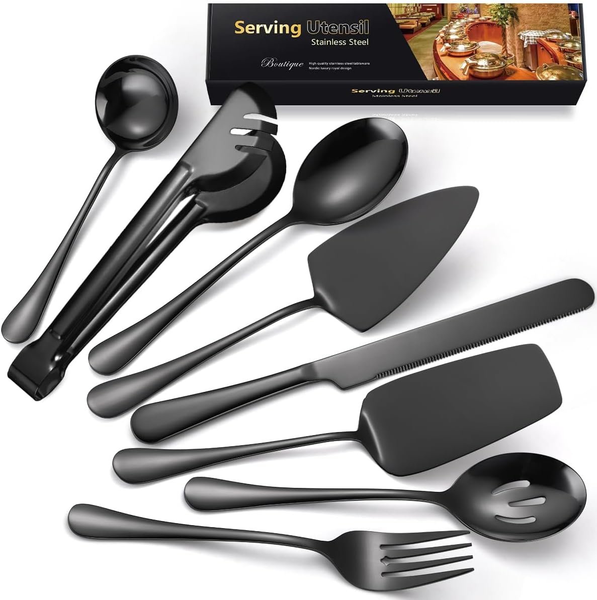 - Upgraded 8 Pieces Serving Utensils Set: The set includes 1 serving spoon, 1 slotted serving spoon, 1 serving tong, 1 serving fork, 1 soup ladle, 1 pie server, 1 cake knife, and 1 cheese slice knife.