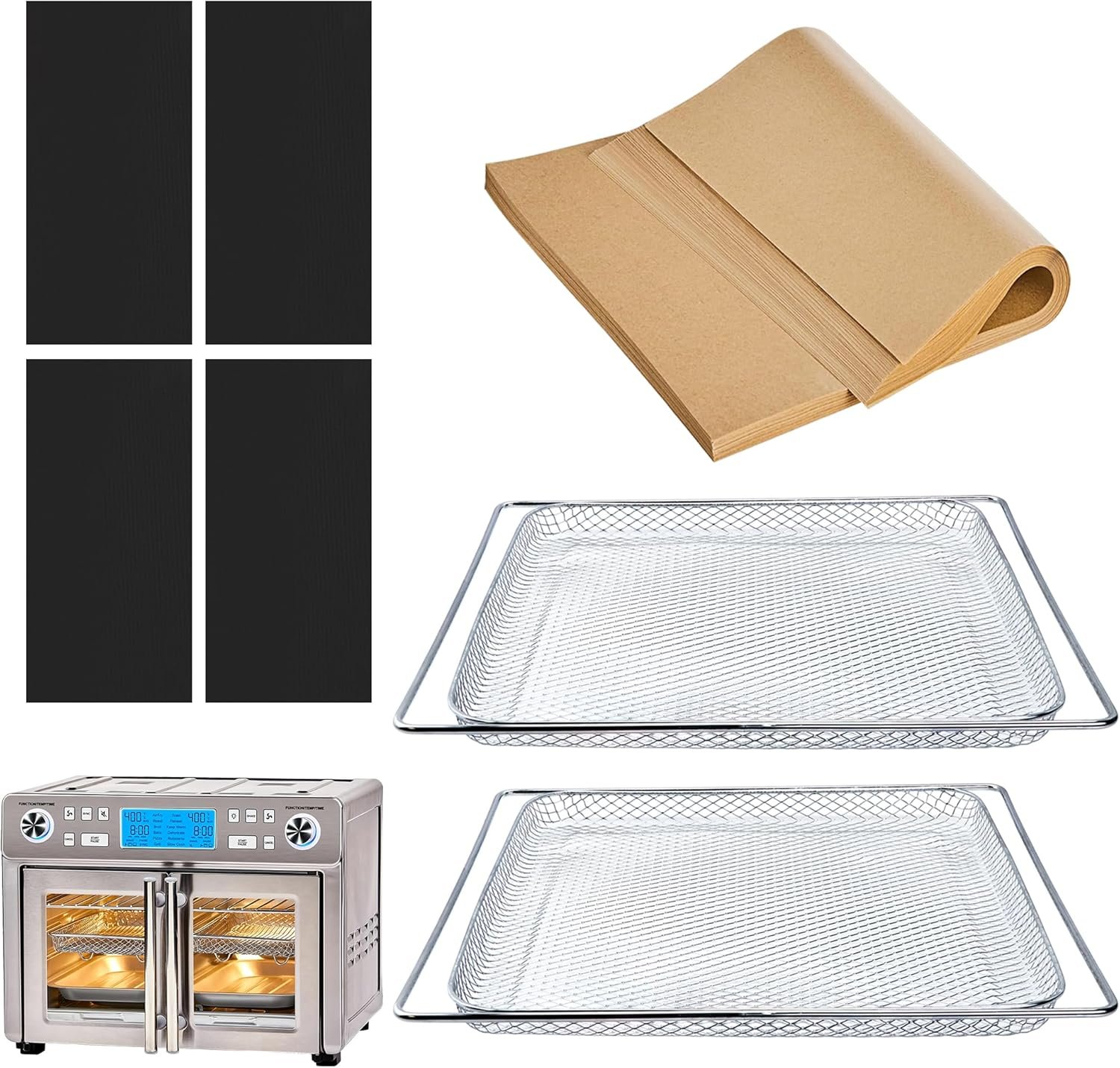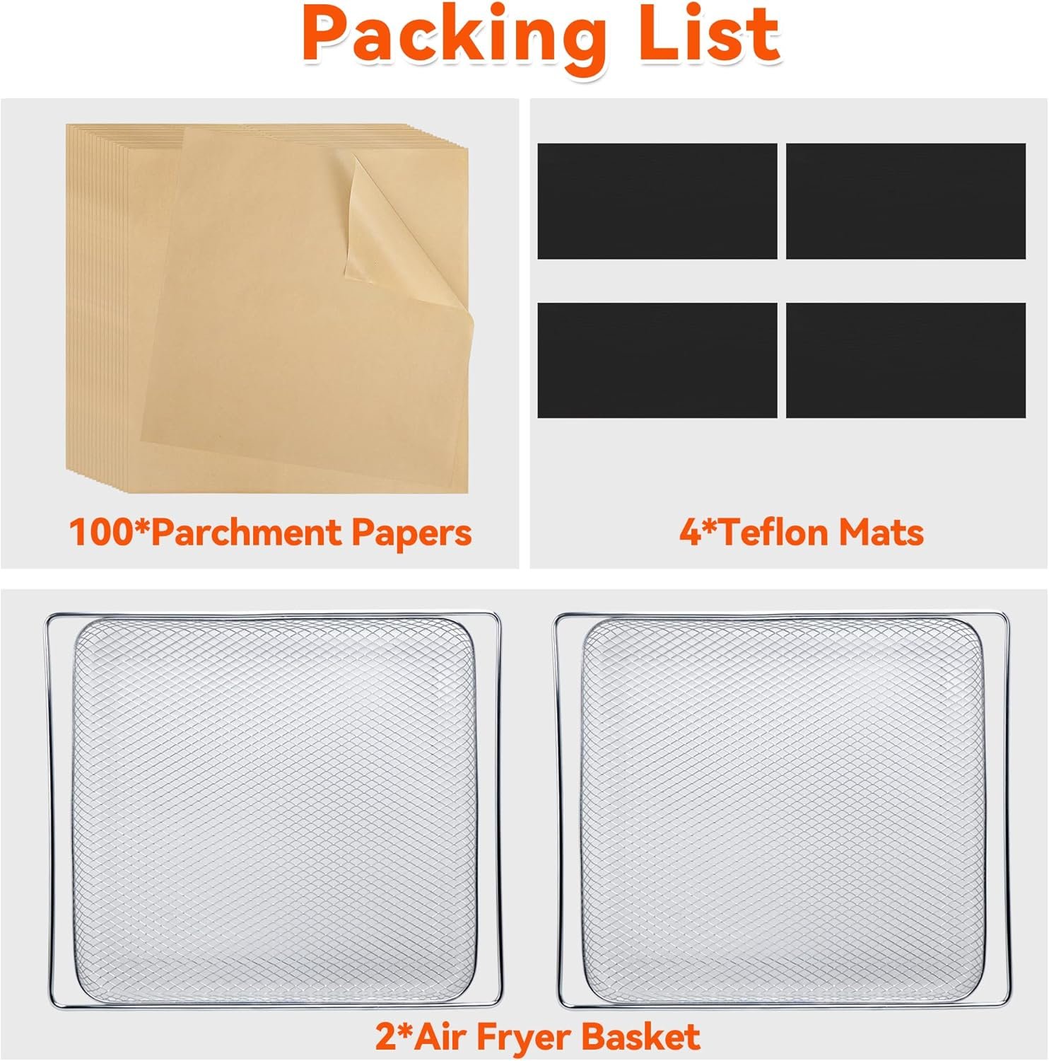 Perfect for 25QT Emeril Lagasse Air Fryer, our air fryer accessories come with 2 durable air fryer baskets, 100Pcs disposable parchment paper sheets, and 4Pcs reusable Teflon mats. They are great compatible with Emeril Lagasse Dual Zone 25QT Extra Large Air Fryer Toaster Oven.