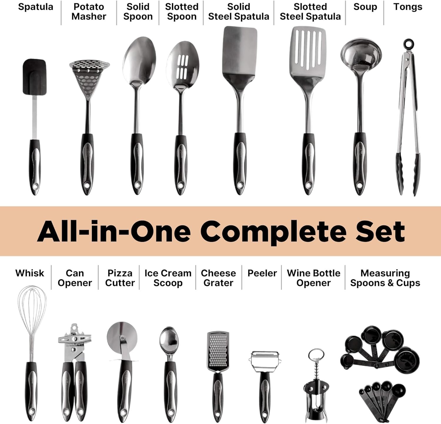 This complete 25-piece kitchen utensil set includes: