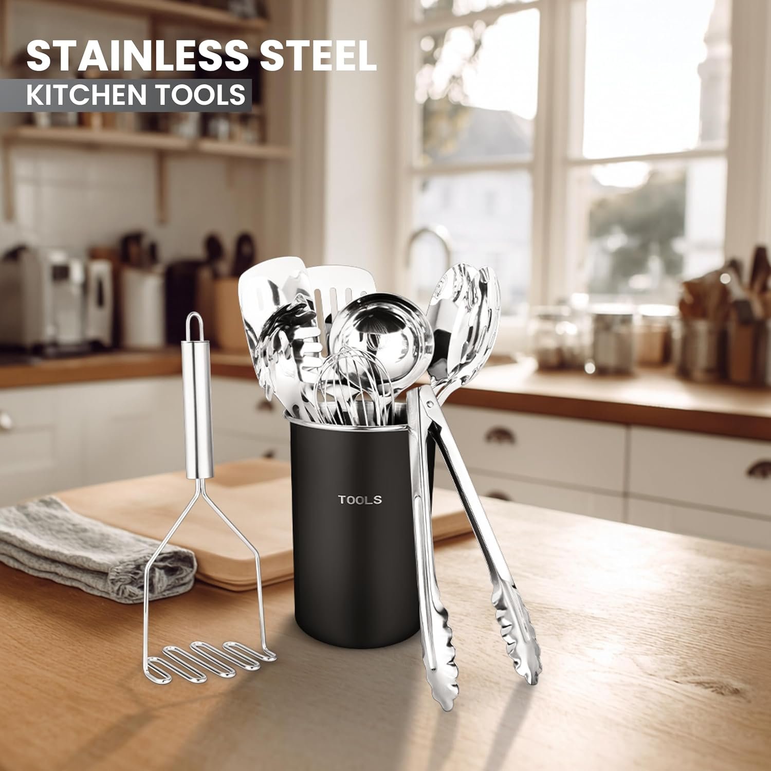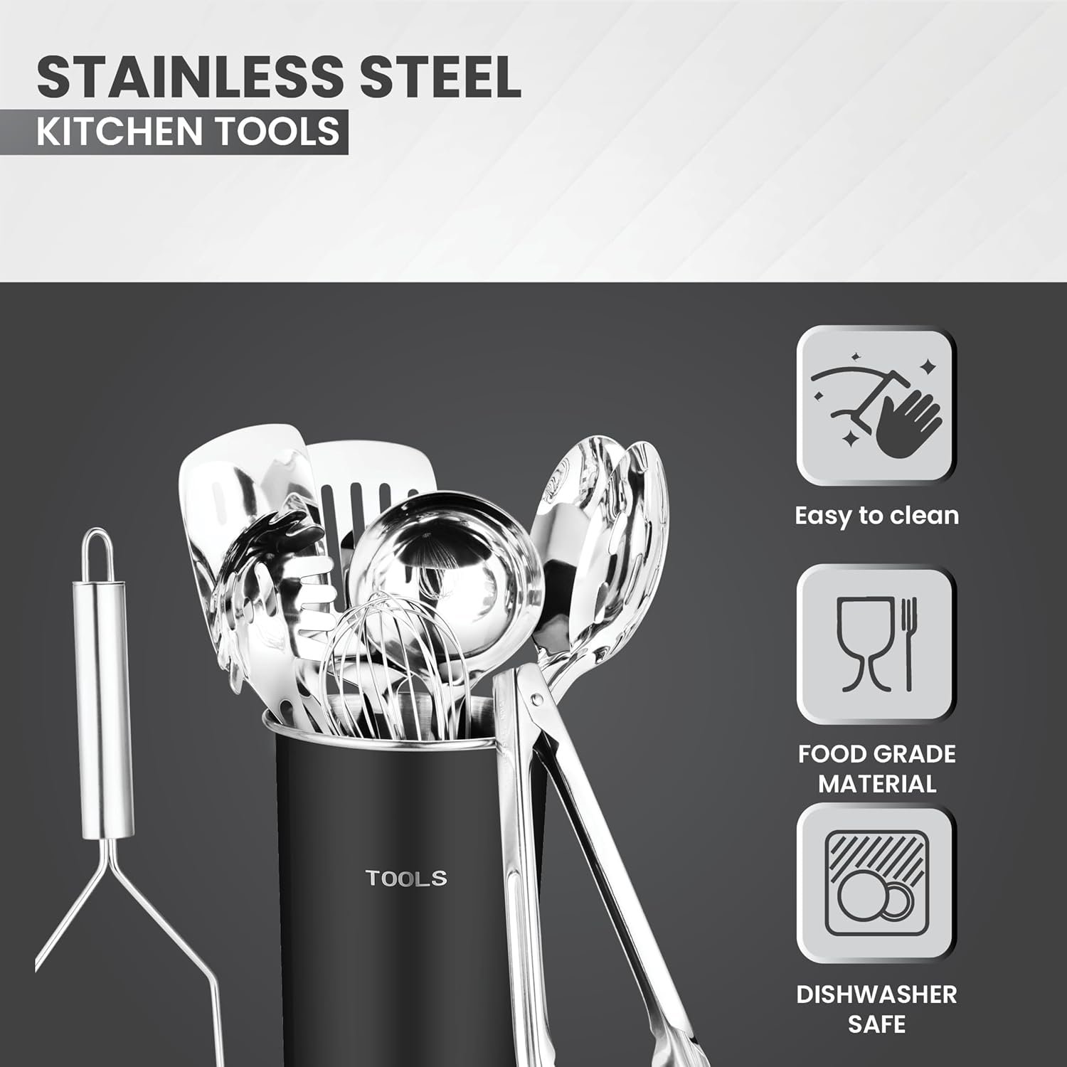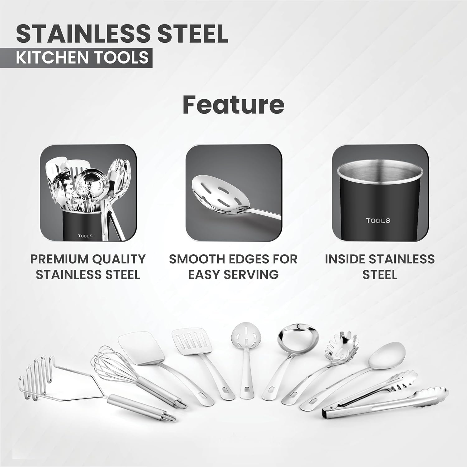 Each tool is crafted from durable, shatter-proof stainless steel—resistant to wear, rust, and daily use. Dishwasher safe and easy to clean, this 10-piece set offers effortless upkeep with a sleek, modern look.