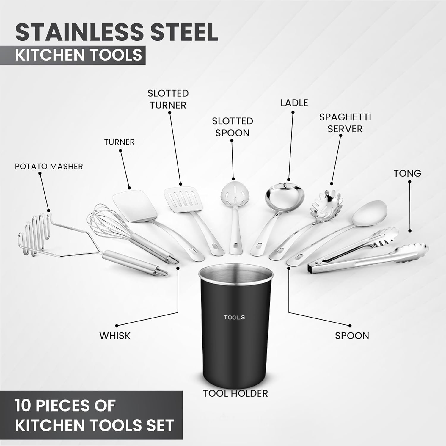 - Set of 10 stainless steel kitchen tools with a black holder