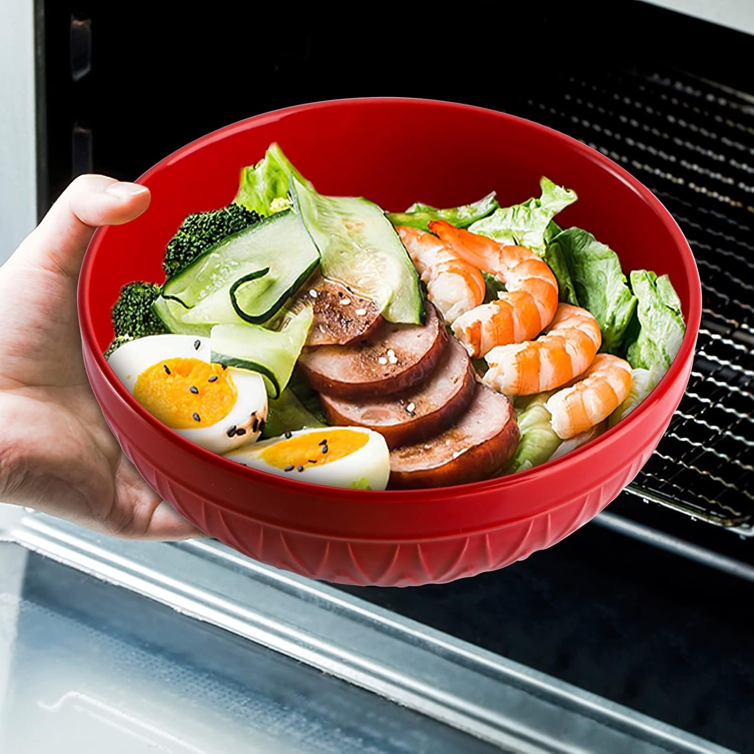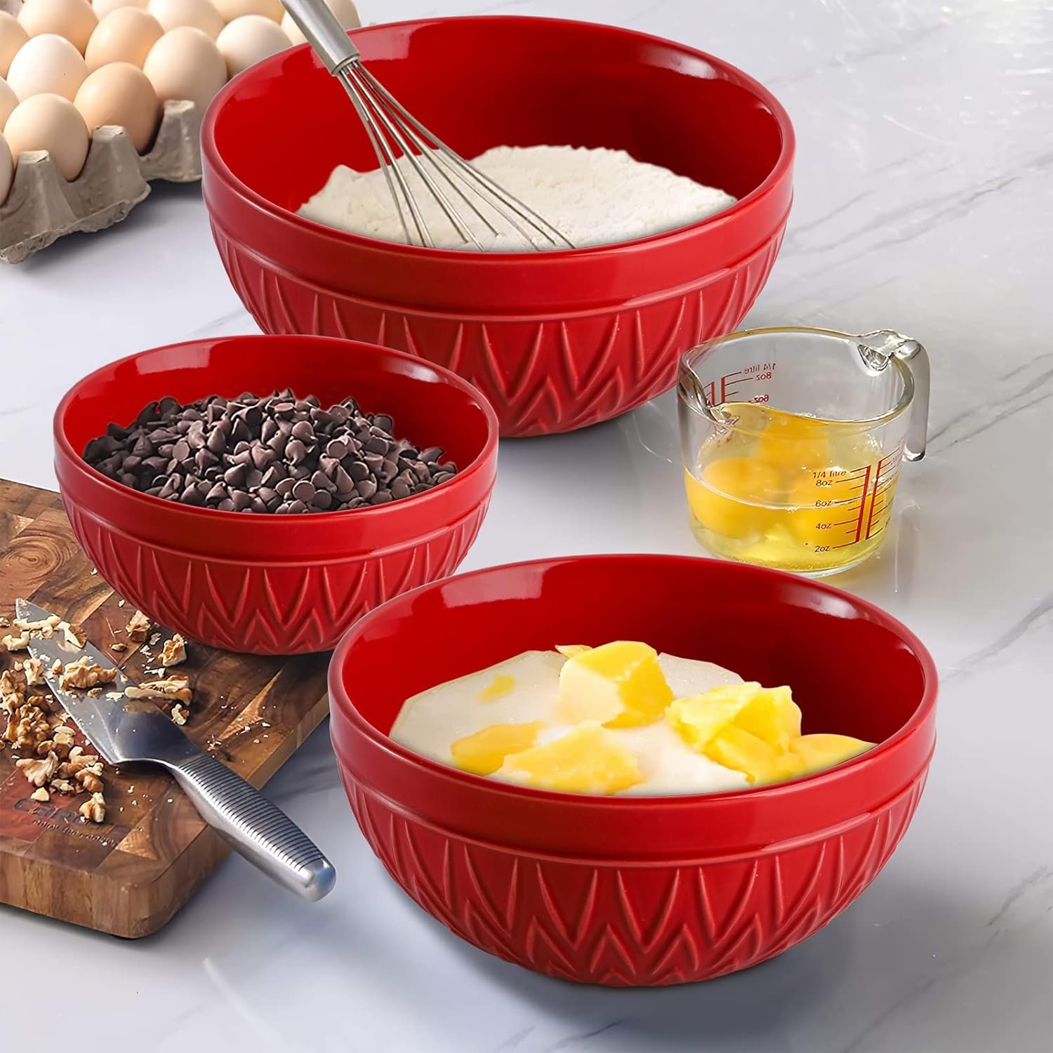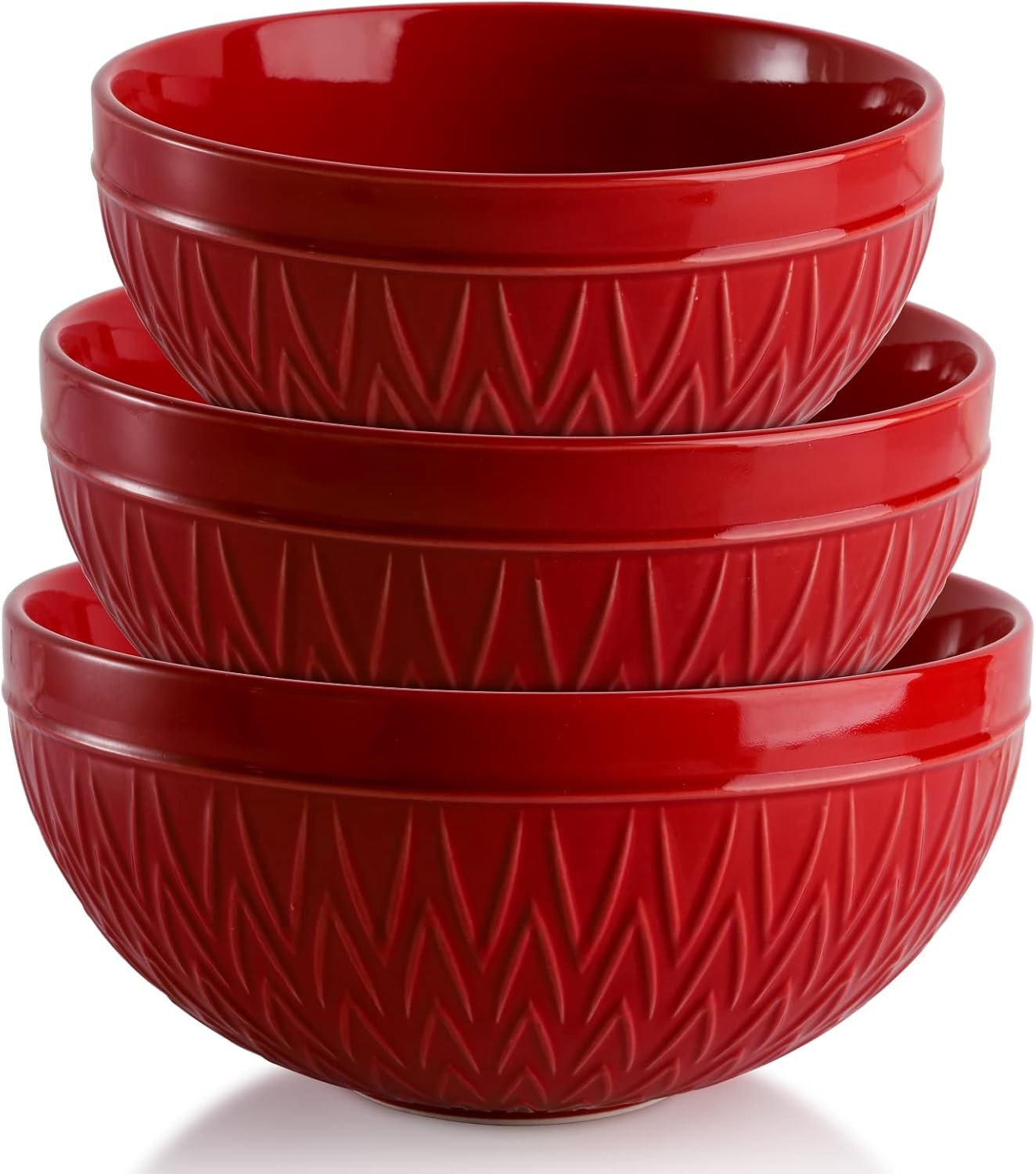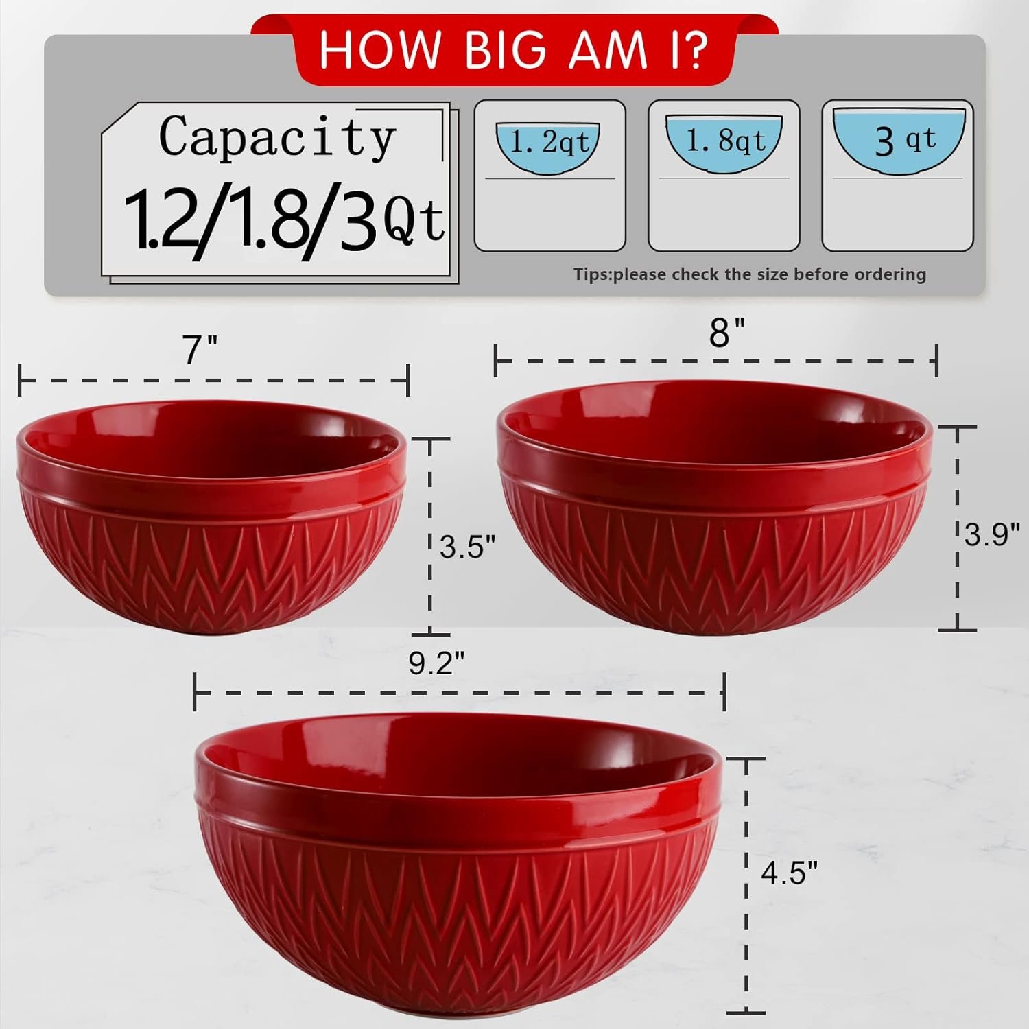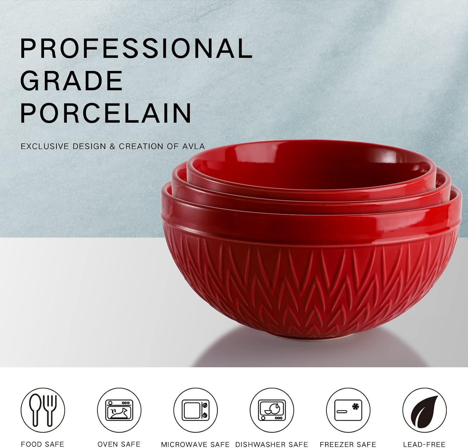 Home Mixing Bowls AVLA Porcelain Mixing Bowls for Kitchen, 3/1.8/1.2 Qt Ceramic Large Serving Salad Soup Bowl Set, Deep Nesting Bowl for Space Saving, 3-Piece Set, Microwave and Dishwasher Safe, Red
