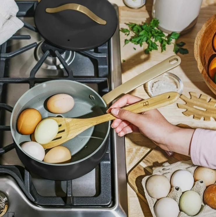 Beautiful 12-Piece Ceramic Non-Stick Cookware Set, Non-Toxic, Induction Compatible, Oven Safe up to 500°F, Dishwasher Safe, by Drew Barrymore (Black)