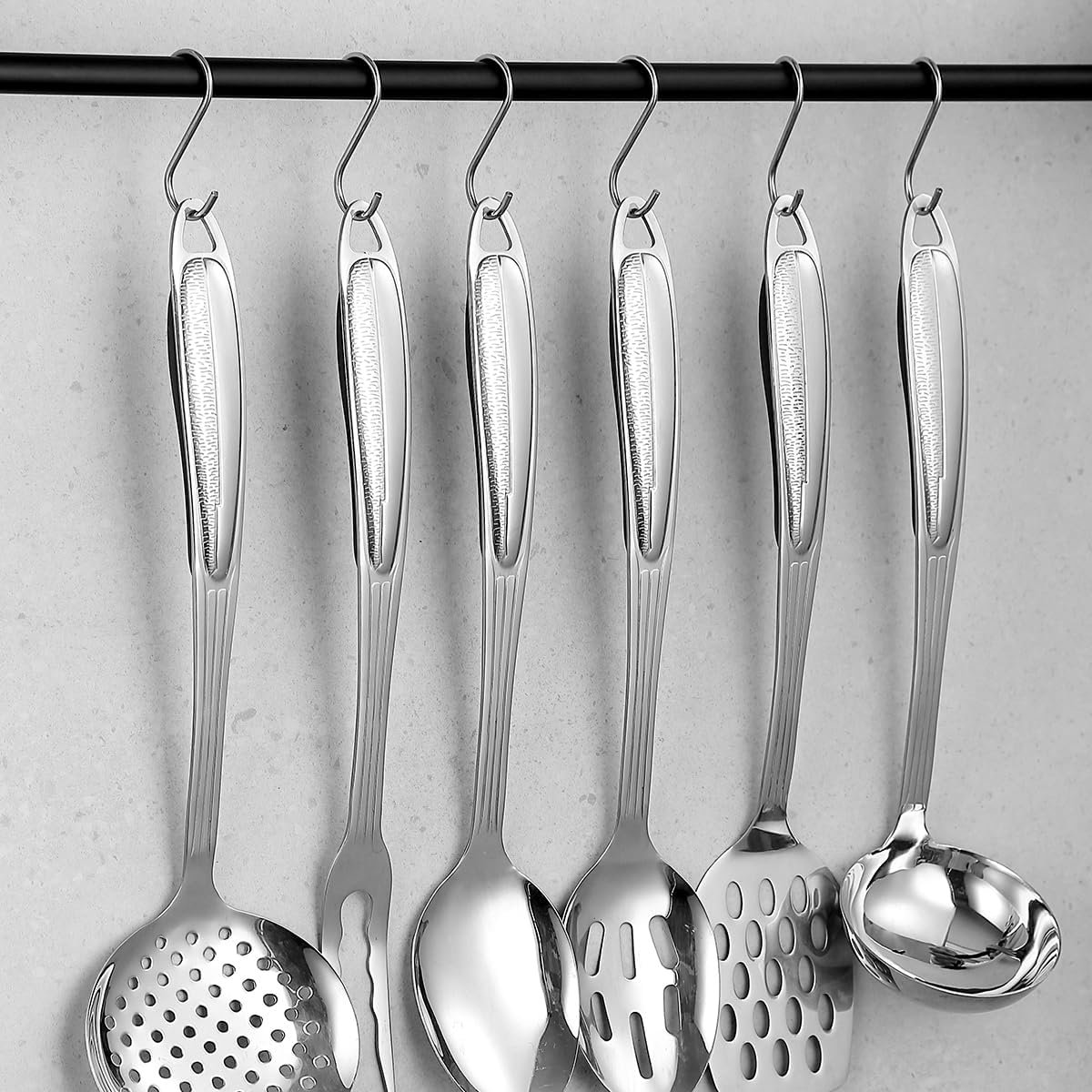 - 6-piece set includes Metal Spatula Set, Skimmer, Ladle, Serving Spoon, Slotted Spoon, and Carving Fork
