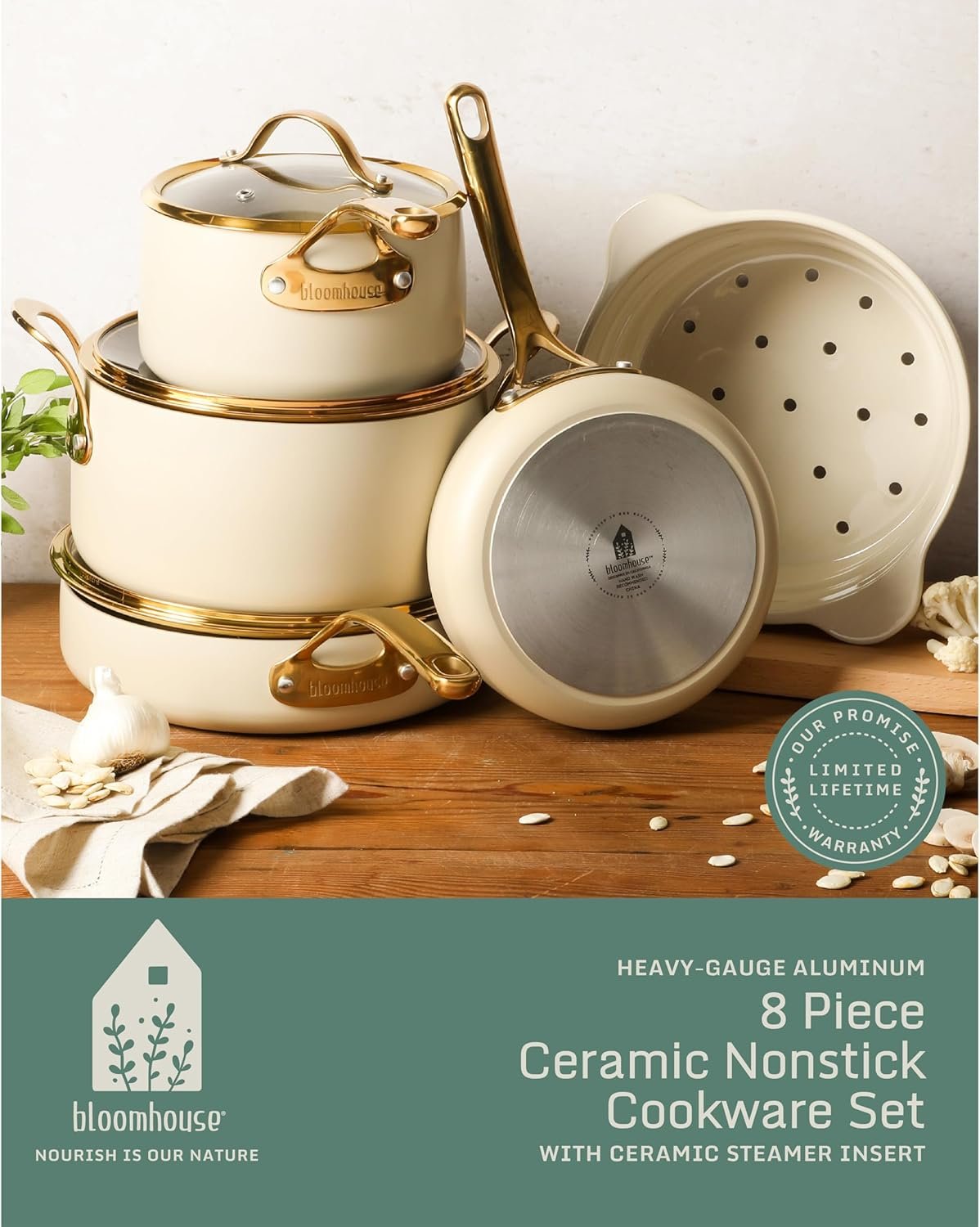 Bloomhouse is a health-driven cookware brand that has been making waves in the industry since being selected as one of Oprah’s Favorite Things in 2022. The brand is committed to developing non-toxic housewares that promote a healthy and delicious lifestyle, starting in the kitchen. The 8-piece Ceramic Nonstick Aluminum Cookware Set is one of their flagship products, designed to deliver optimal heat distribution and nonstick performance for safer and health-conscious cooking.