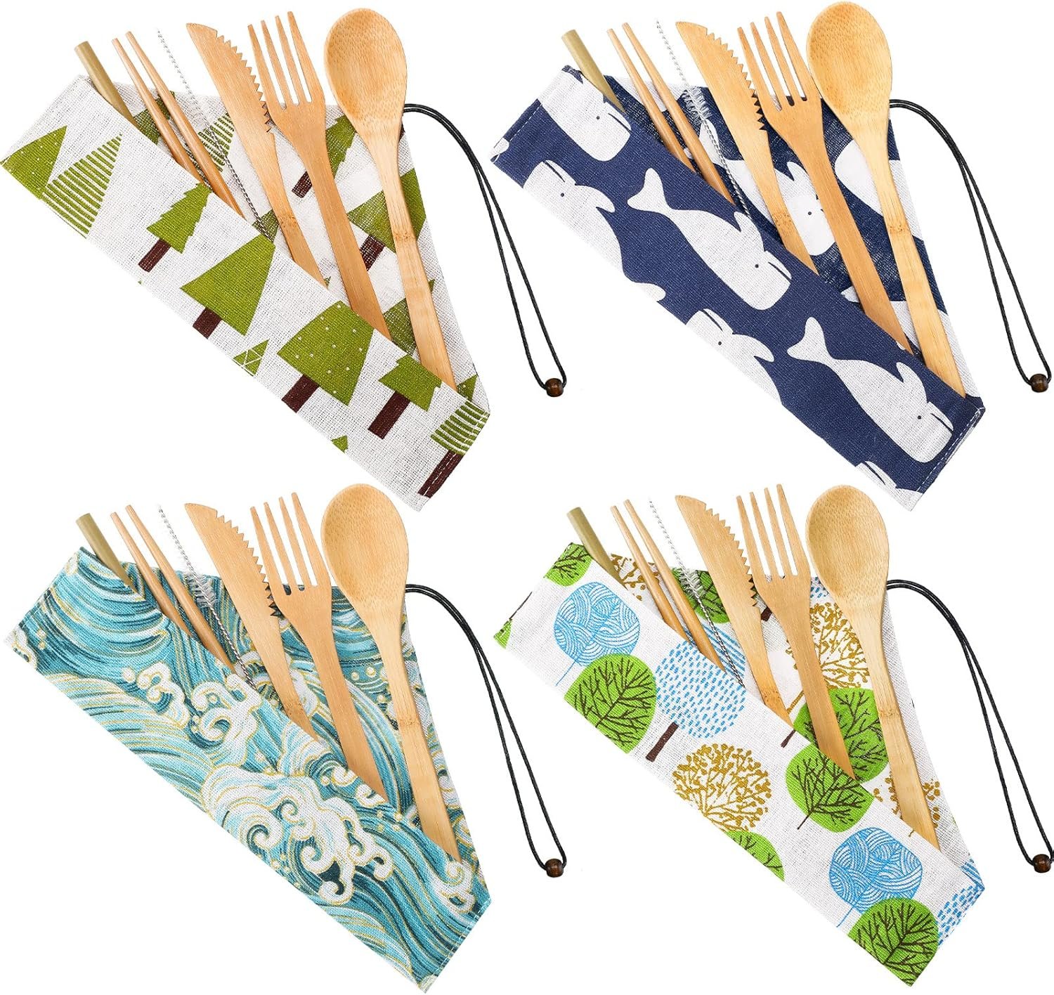 Package includes: 4 pieces camping utensils sets are wrapped in 4 different cloth bags, each bamboo tableware set contains 1 fork, 1 knife, 1 spoon, 1 pair of chopsticks, 1 straw, 1 brush with 1 cloth storage bag.