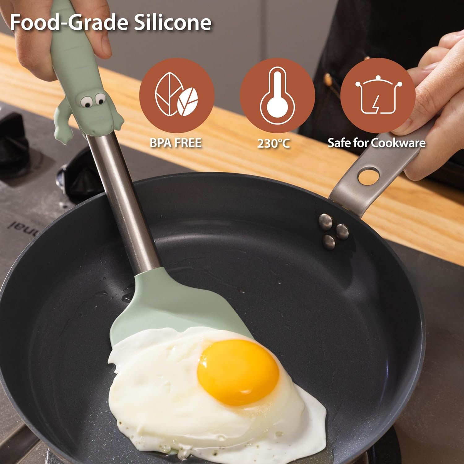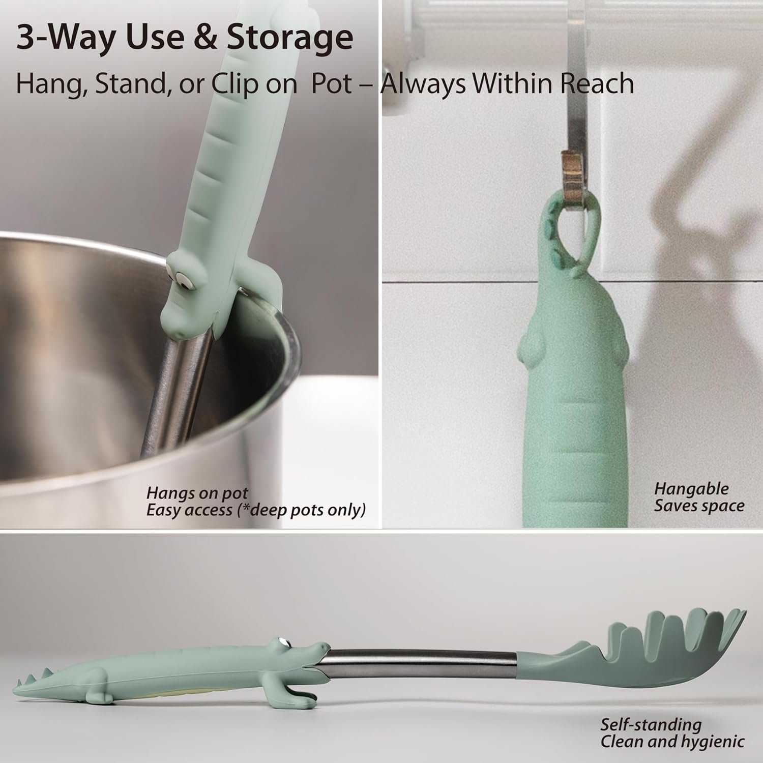 • Croc Inspired Multi Position Handle: The adorable crocodile-shaped handle is heat-proof, skin-friendly, and supports self-standing, hooking onto pot edges, or hanging by the tail.