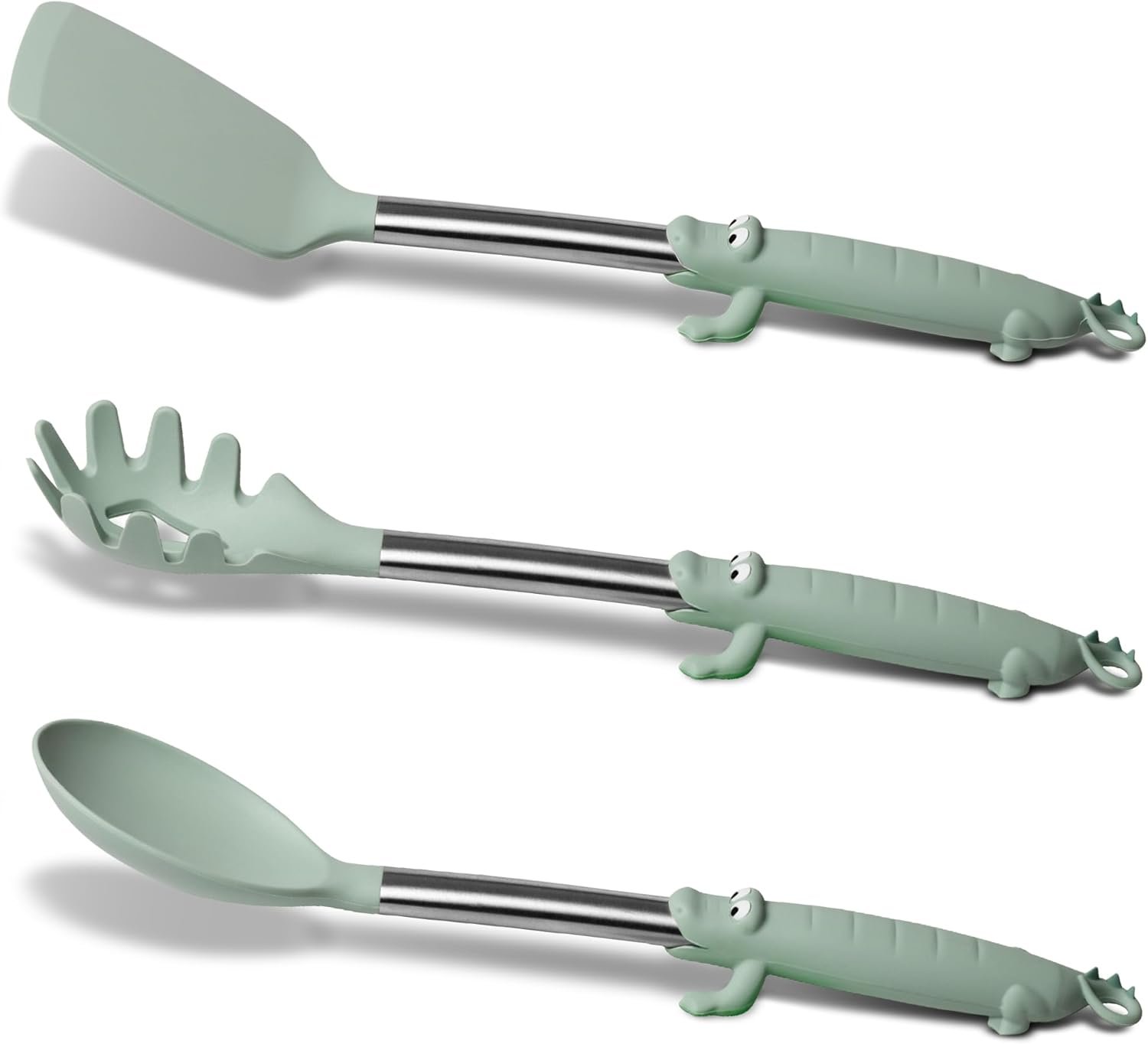 BONE Stylish Kitchen Utensils Set (3 Pcs), Self-Standing Cooking Tools with Cute Croc Handle, Heat Resistant & BPA Free, Food Grade Silicone Cute Kitchen Utensils with Spatula, Spoon, Pasta Server