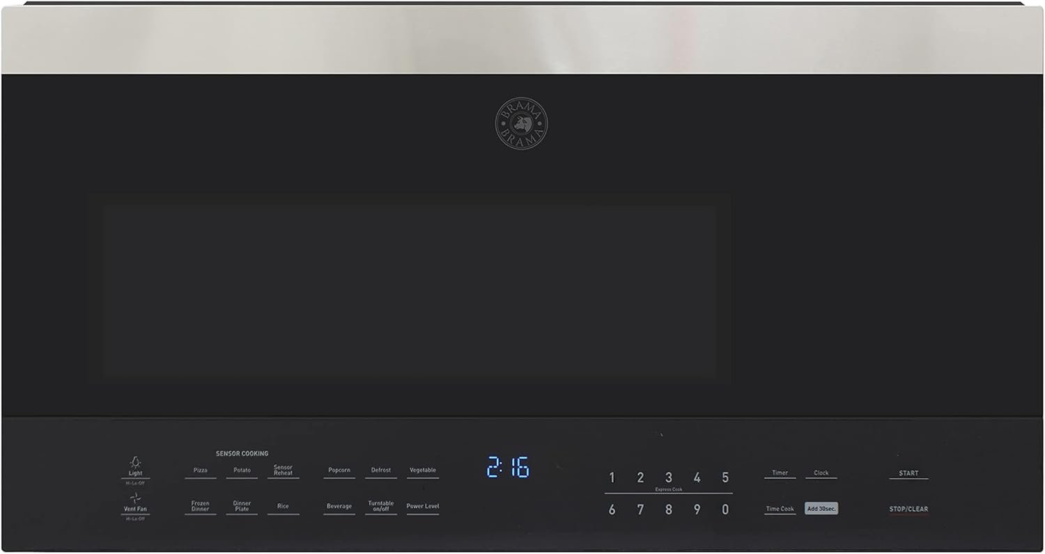 Home Microwave Oven BRAMA Microwave Oven 1000-Watts Over the Range with Sensor Cook and Defrost, Pre-Set Cooking Modes, Child Safety Lock, Electronic Control Panel and Glass Turntable and Hidden Vent, 1.6 Cu.Ft., Black