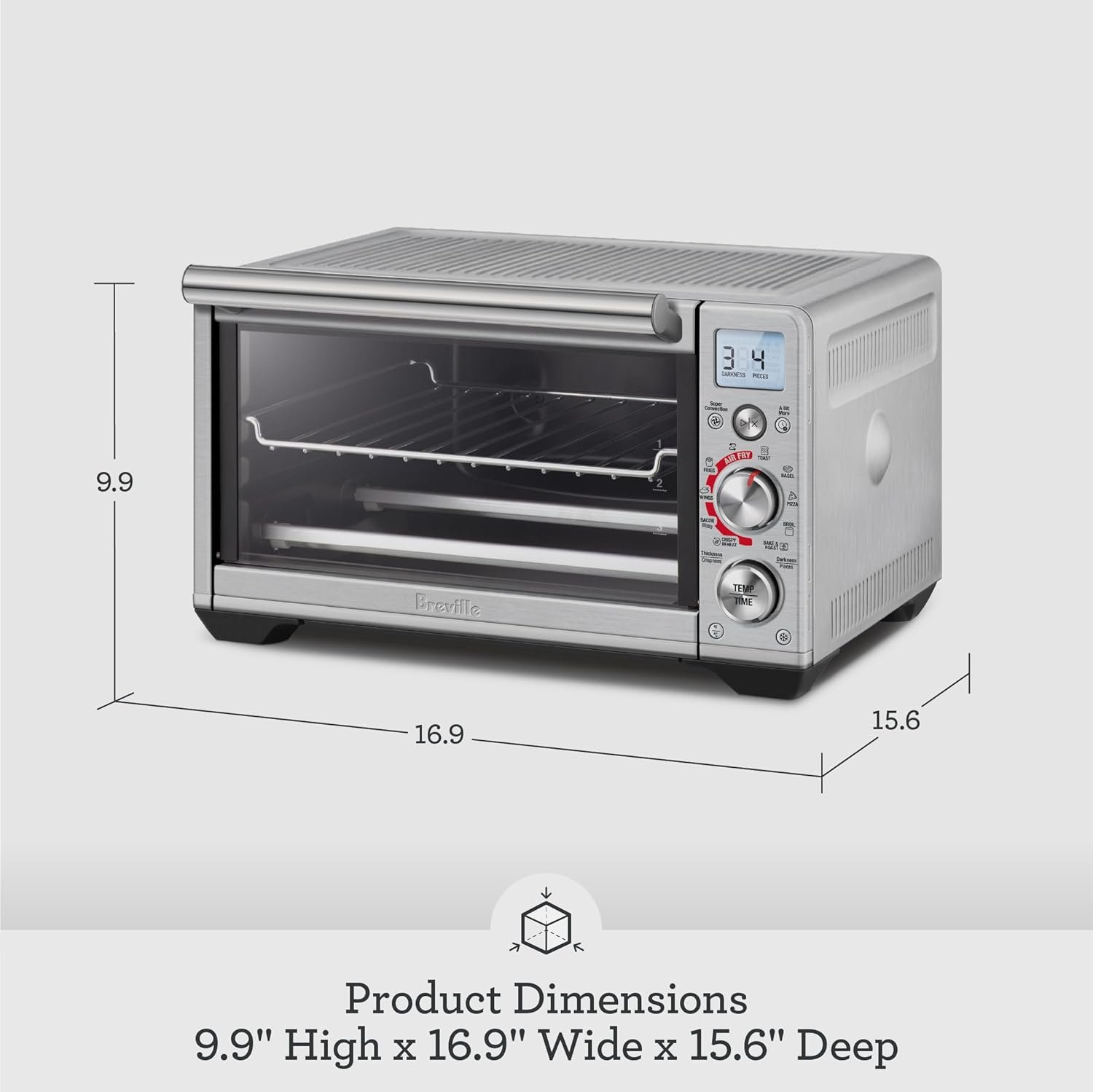 – A compact footprint that allows you to cook for the family, roasting a whole 4.5lb chicken, air frying 1lb of French Fries, cooking an 11inch Pizza, and toasting 4 slices at a time