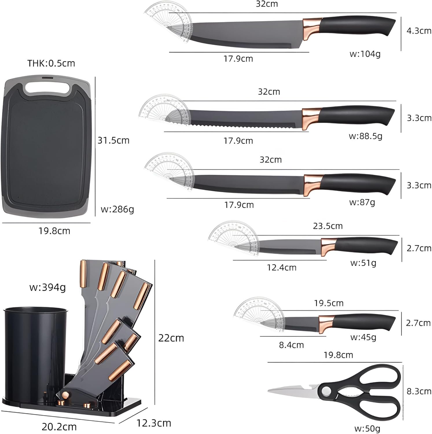 • 5 Professional-Grade Knives: Chef’s knife, bread knife, carving knife, utility knife, and paring knife – crafted with ultra-sharp stainless steel blades for effortless slicing and precision.