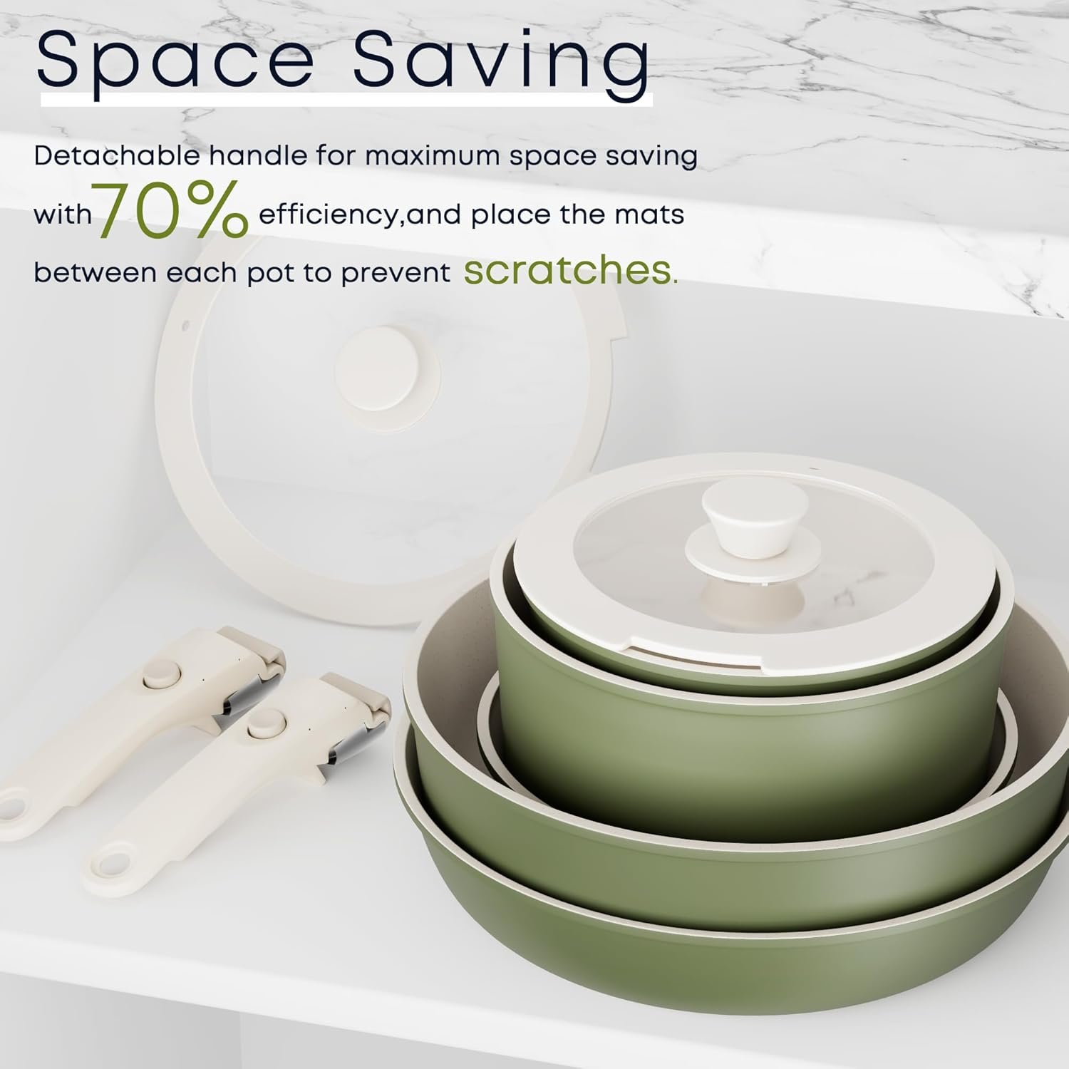 - 70% space-saving: Perfect stacking of nonstick cookware set in storage compartment like drawers, cabinets, RV, camping use, travel trailer, motorhome.