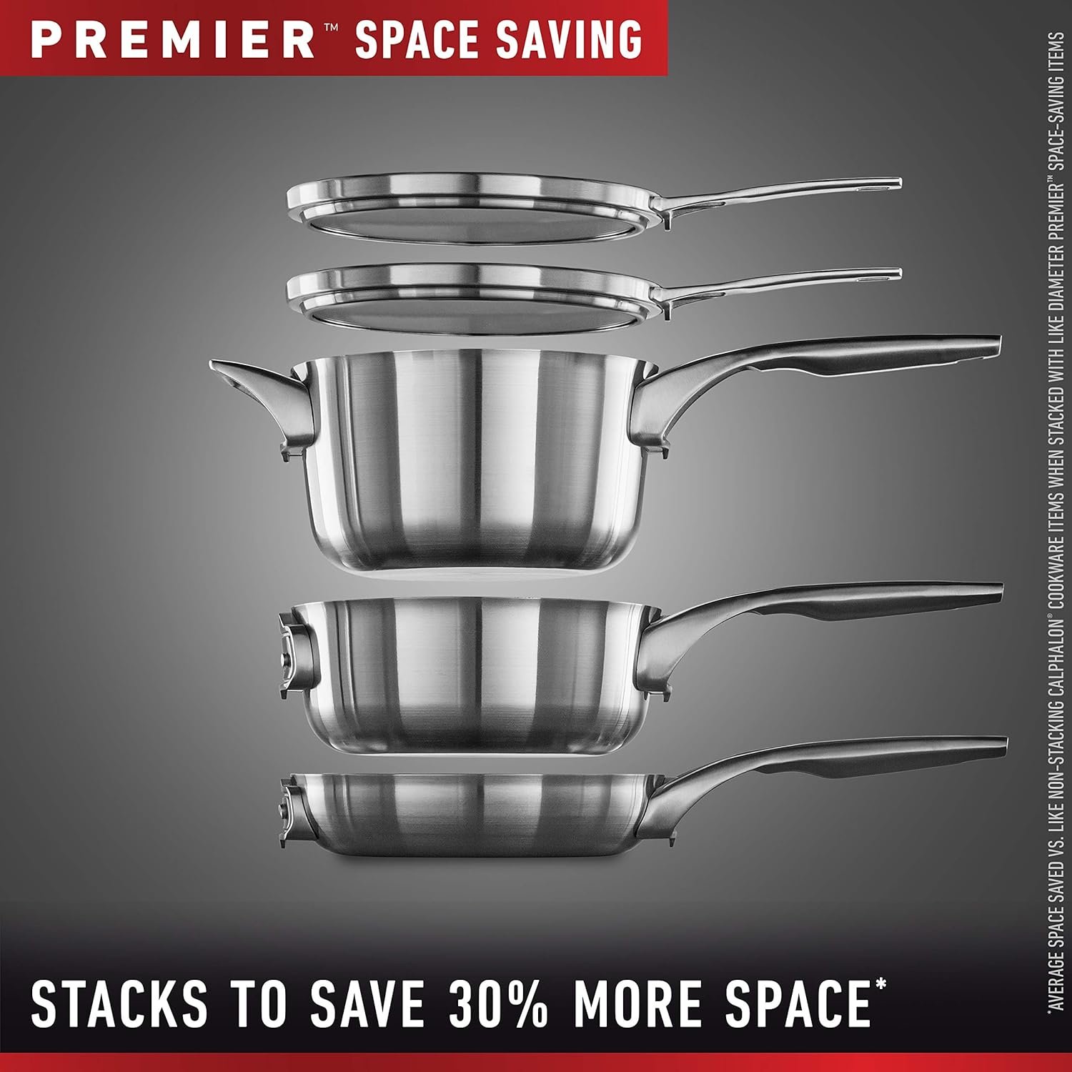 Calphalon Premier Stainless Steel Cookware delivers precision cooking performance, with an elegant, classic look that will inspire any chef. The unique, space-saving design securely stacks to save 30% more space, and the cookware and flat glass covers stack and nest in any order.