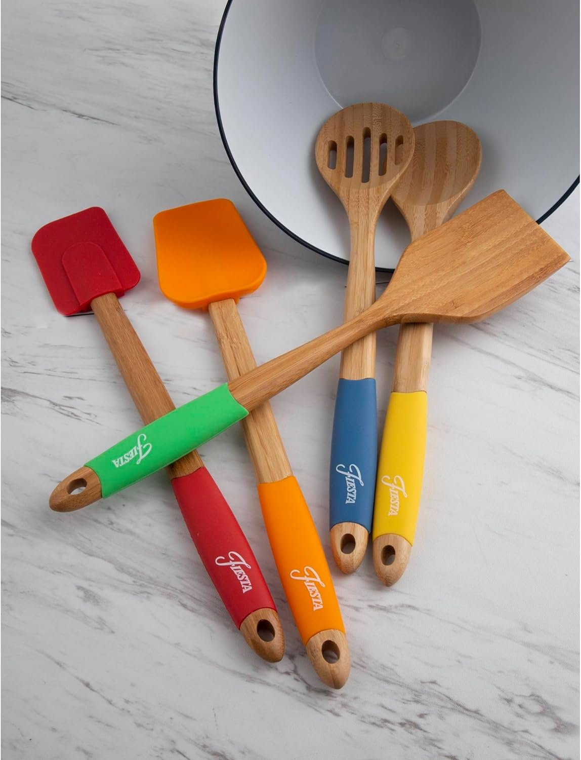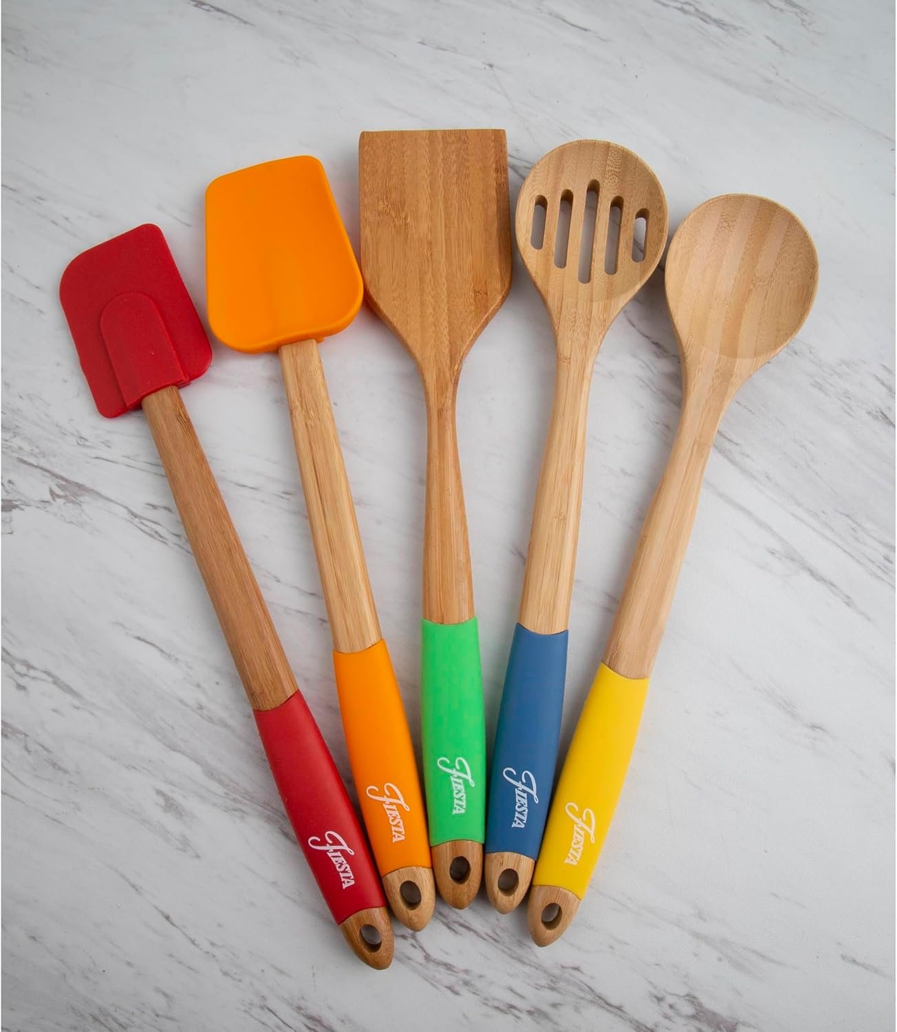 • The set includes one each of a bamboo turner, bamboo spoon, bamboo slotted spoon, silicone spatula, and silicone turner