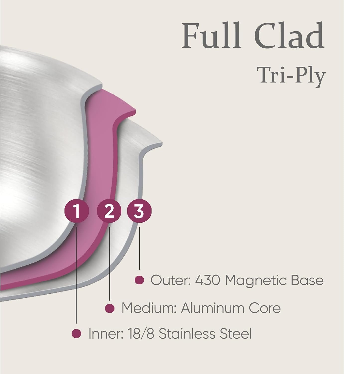 - Full tri-ply clad construction to prevent warping and hot spots