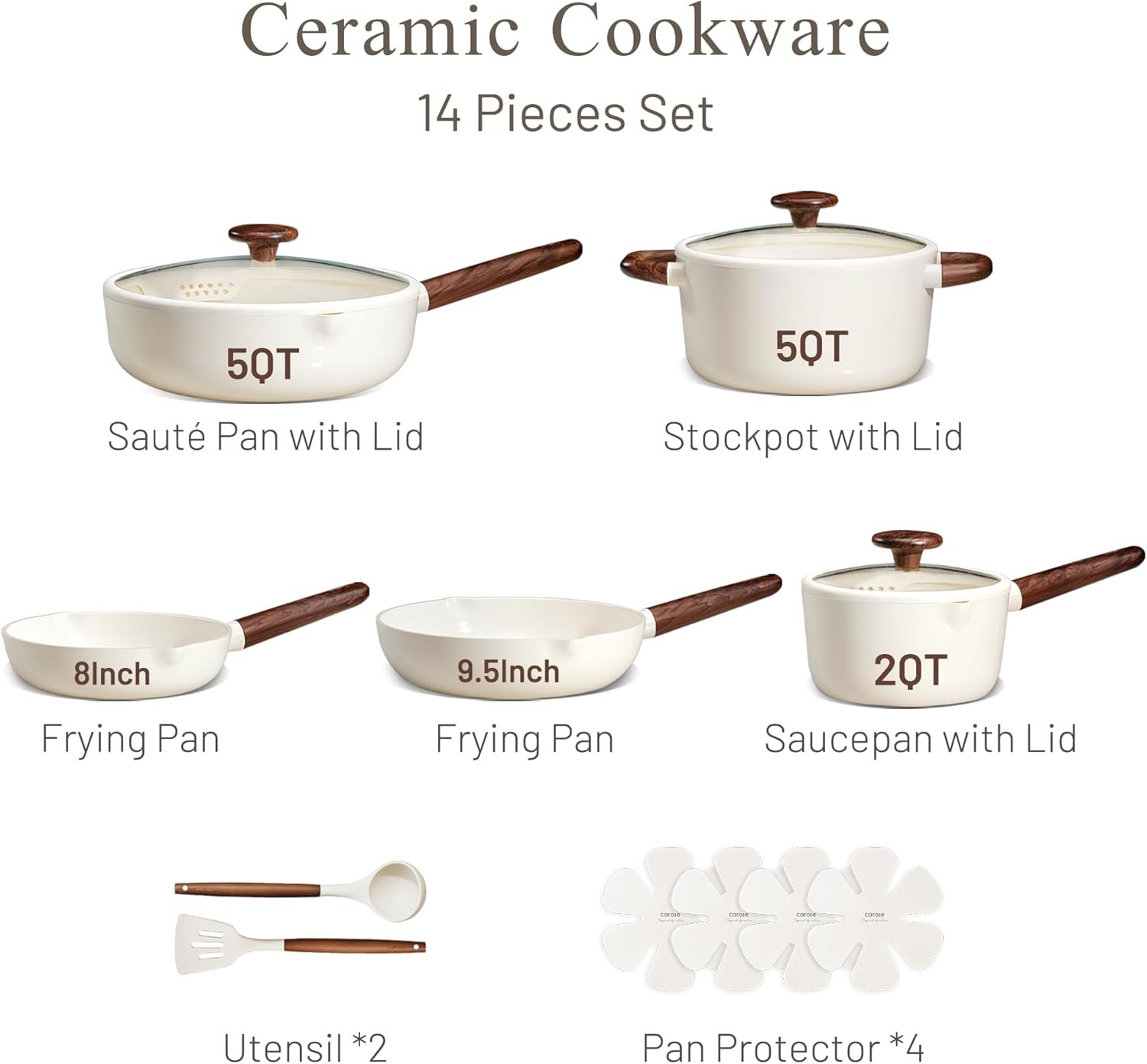 • Set includes: 8” fry pan, 9.5” fry pan, 2-qt saucepan with lid, 5-qt stockpot with lid, 5-qt sauté pan with lid, 2 utensils, and 4 pan protectors
