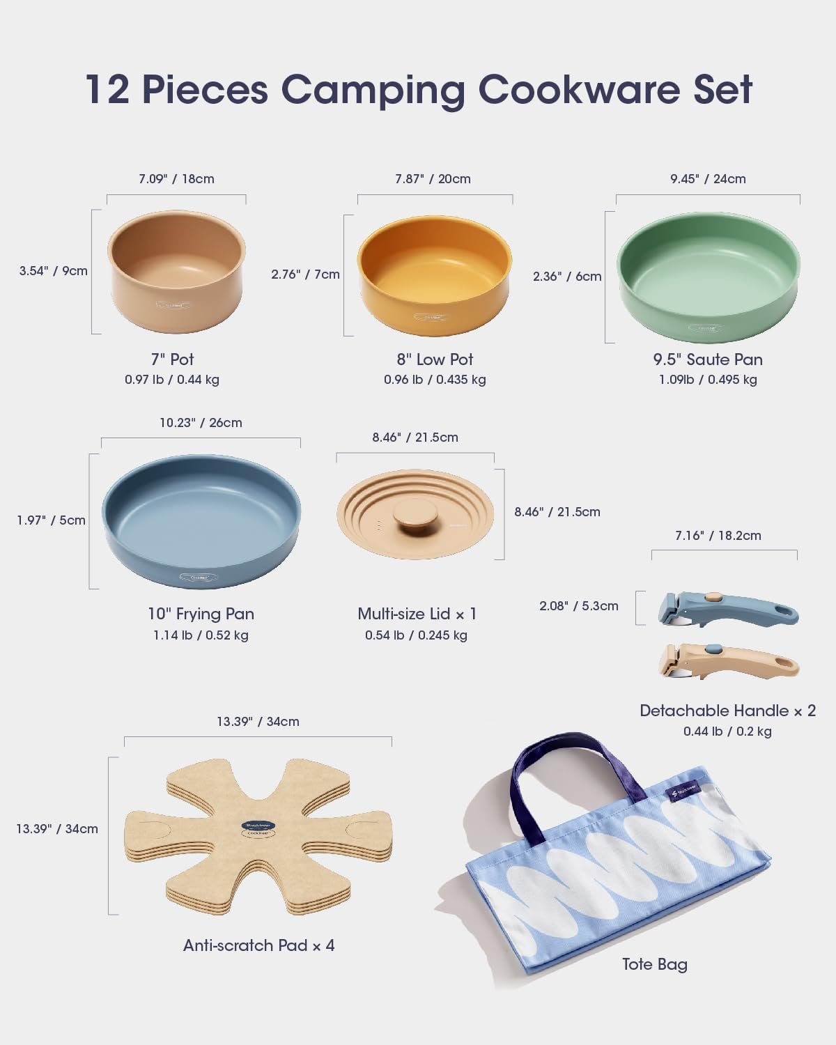 The Stackbear 12-Piece Cookware Set is a comprehensive and versatile nonstick cookware set designed for outdoor enthusiasts and RV owners. This set includes a 7″ pot, 8″ low pot, 9.5″ saute pan, 10″ frying pan, a multi-size lid, two detachable handles, four anti-scratch pads, and a storage bag. The unique carry bag enables easy transport for family picnics or hiking trips, making it an ideal solution for outdoor cooking.