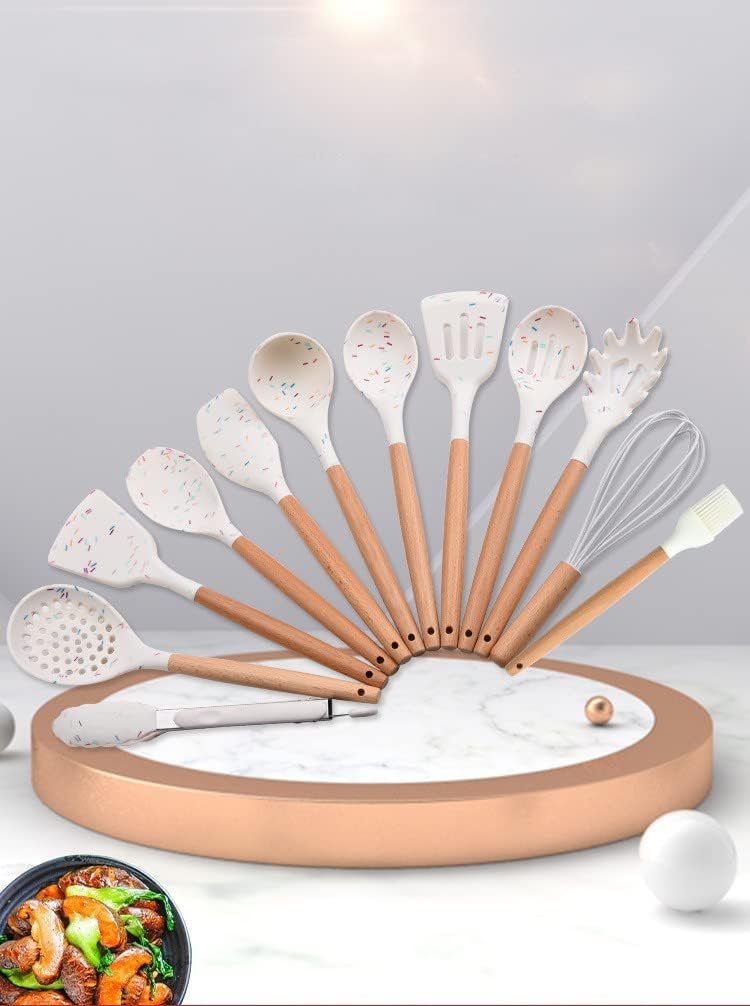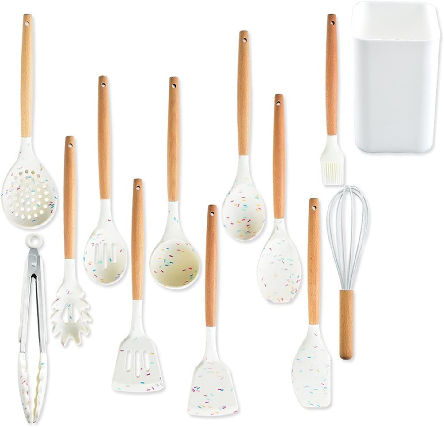 Home Cooking Utensil Sets Chef Kitchen Cooking Utensils Set, Wooden Handle Silicone Kitchen Gadgets Utensil Set,11 pcs Non-Stick Silicone Cooking Kitchen Utensils Spatula (White)