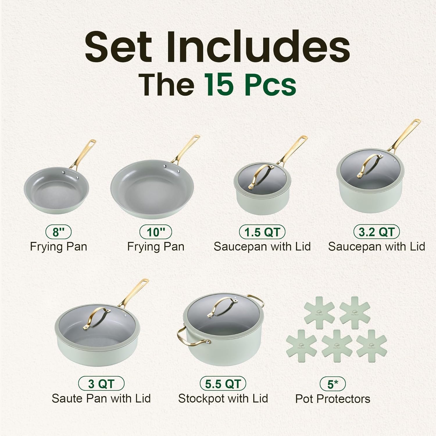 - 15Pcs Cookware Set: Includes 1.5QT saucepan, 1.5QT saucepan lid, 3.2QT saucepan, 3.2QT saucepan lid, 8″ frying pan, 10″ frying pan, 3.0QT sautepan, 3.0QT sautepan lid, 5.5QT casserole, 5.5QT casserole lid, and 5 Protectors
