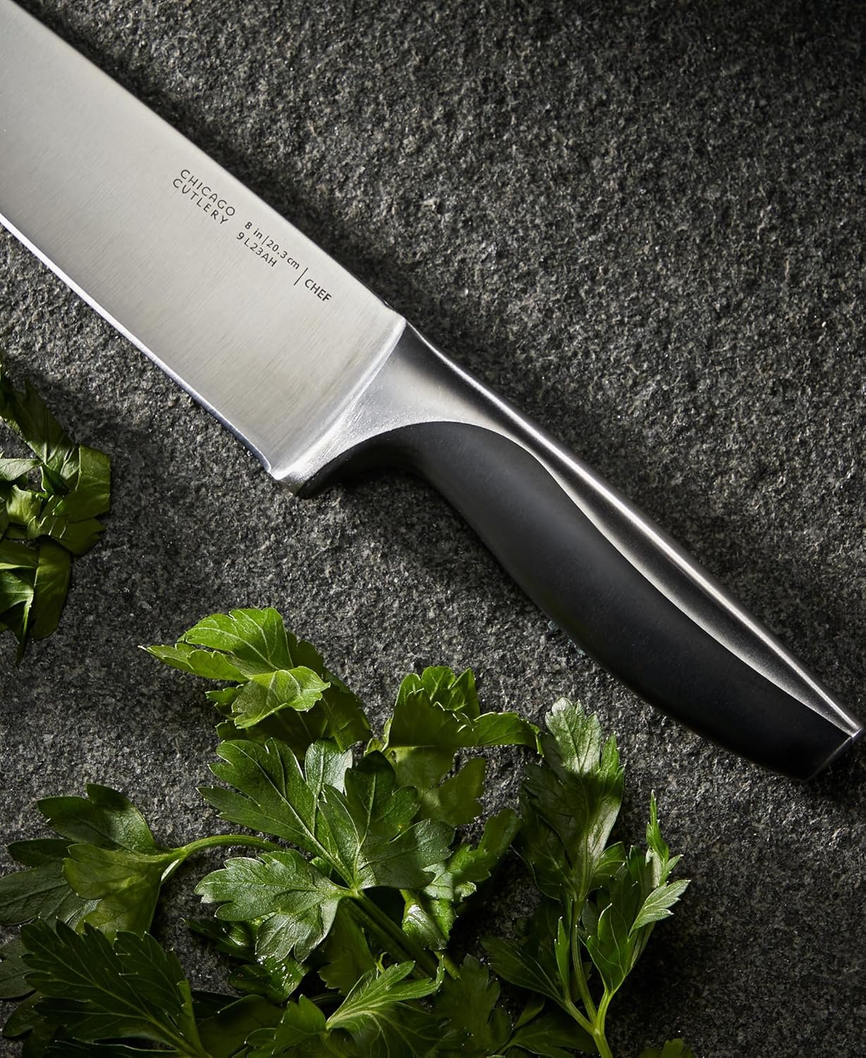 The Chicago Cutlery Avondale set is a comprehensive collection of kitchen cutting tools, designed to provide a comfortable and efficient cutting experience. The set includes a range of knives, including an 8-inch chef knife, 8-inch bread knife, 5.5-inch utility knife, 3.5-inch pairing knife, and six 4.5-inch steak knives, as well as a pair of kitchen shears. The knives feature high-quality, stainless-steel blades with a 26-Degree Taper Grind edge, providing optimum sharpness and resistance to stains, rust, and pitting.