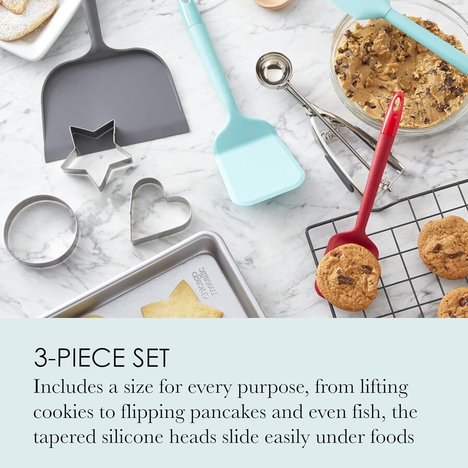 • 3 Essential Sizes: The set includes a small cookie lifter, a medium turner, and a large, extra-wide turner, ensuring that you have the perfect tool for lifting cookies, flipping pancakes, and managing other oversized foods.