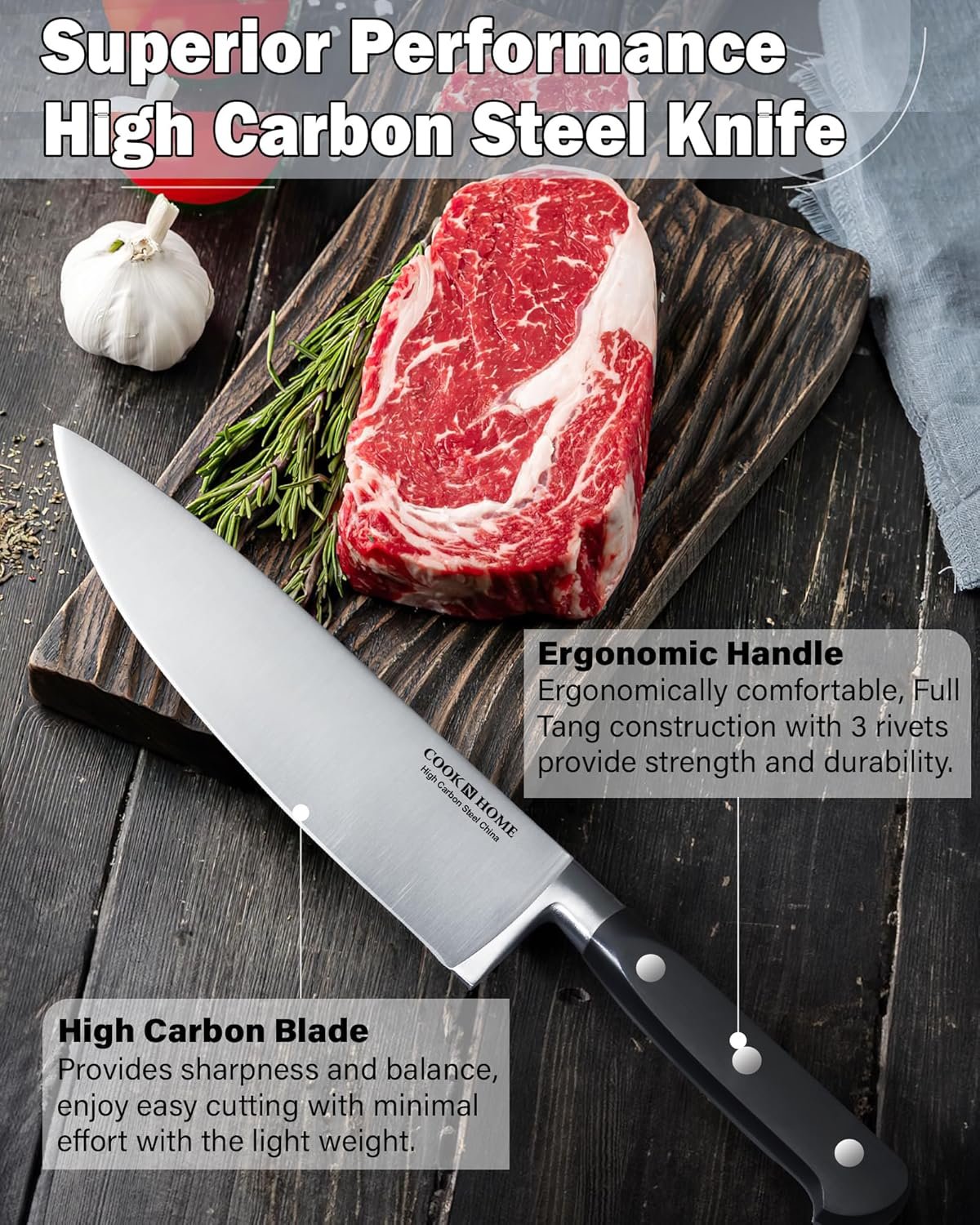 The knives in this set are made of superior high carbon steel, which provides sharpness and balance, allowing for easy cutting with minimal effort. The ergonomic design of the handles ensures comfort during use, while the bakelite material is hygienic. The full tang construction with 3 rivets adds strength and durability to the knives. The set also includes a high-grade bamboo storage block that keeps the knives organized and within easy reach.