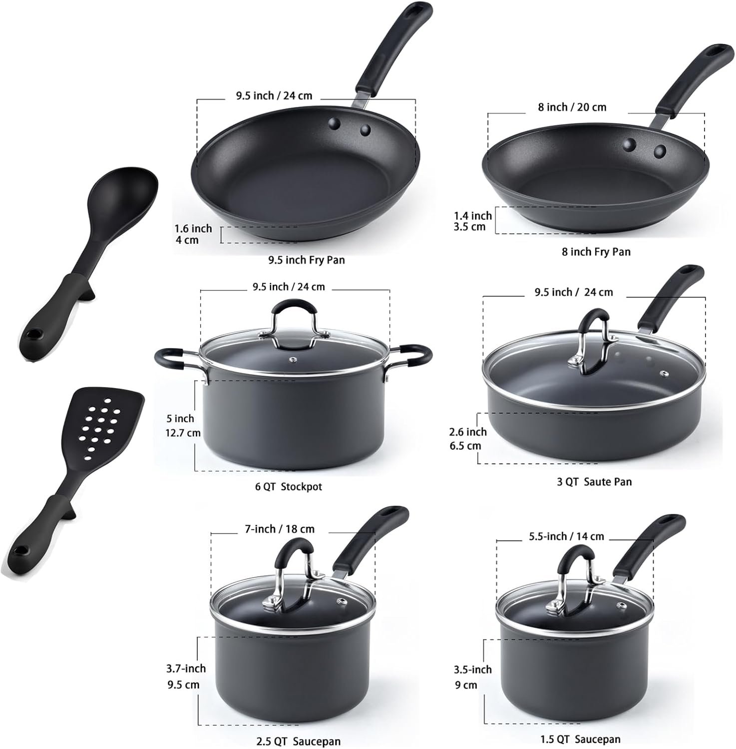 The Cook N Home Professional Hard Anodized Nonstick Pots and Pans 12-Piece Cookware Set is a comprehensive cooking solution that includes 1.5 and 2.5 quart saucepans with lids, 6 quart stockpot with lid, 3 quart sauté pan with lid, 8 and 9.5 inch frying pans, a nylon spatula, and a spoon. This set is designed to provide you with all the necessary tools to prepare a variety of dishes with ease.