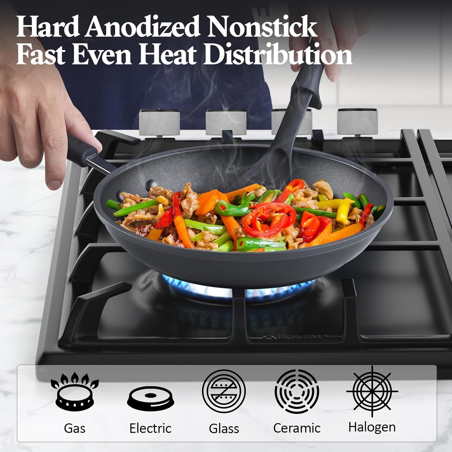 The Cook N Home Professional Hard Anodized Nonstick Pots and Pans 12-Piece Cookware Set works on gas, electric, glass, ceramic, halogen, and more stovetops, but it’s not induction compatible. The set is oven safe up to 400℉, making it a versatile cooking solution.